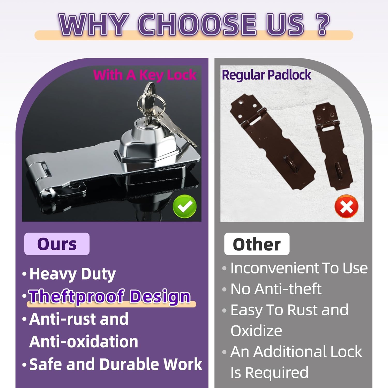 - 【Automatic Fast Security Lock】With automatic lock cylinder, it can be quickly locked by directly turning it 90°.The keyed hasp lock uses high quality lock core and comes with keys, which is simple but secure and eliminates the need for padlocks, offers reliable protection against intruders.
