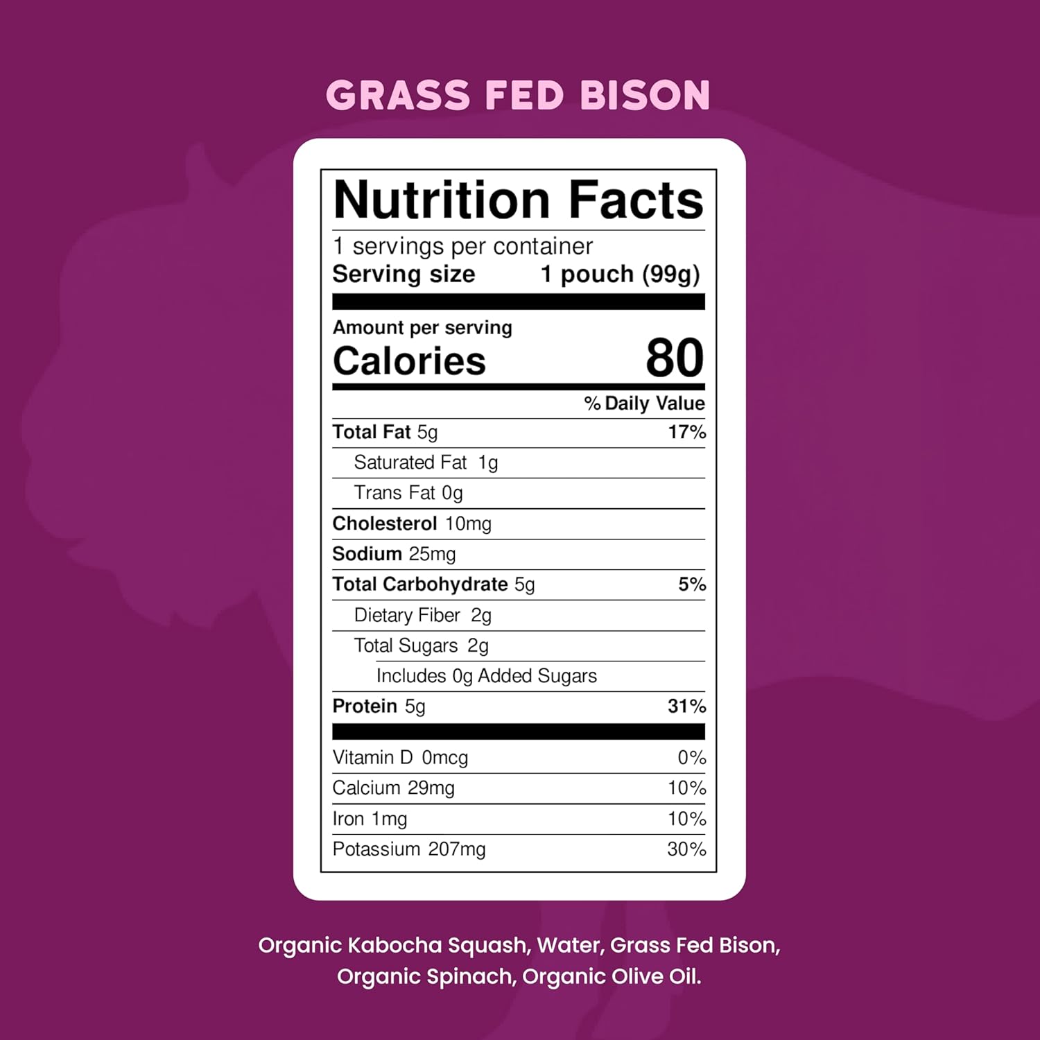 - BISON GOODNESS: Dive into the yum of 12 bison baby food pouches. Grass-fed bison, organic kabocha squash, and spinach make a savory meal that's both tasty and nutritious