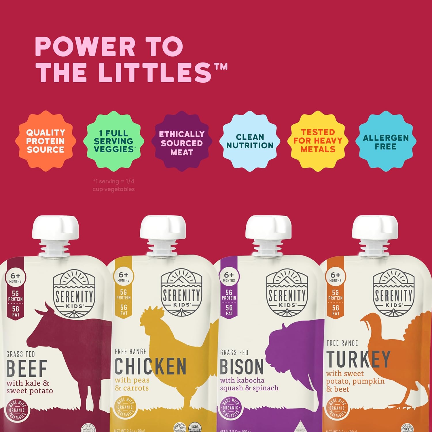 Serenity Kids 6+ Months Baby Food Pouches - Ethically Sourced Meat & Organic Veggies - High Protein Savory Baby Puree Pouches for Baby Snacks - 3.5 Oz, 8 Pack
