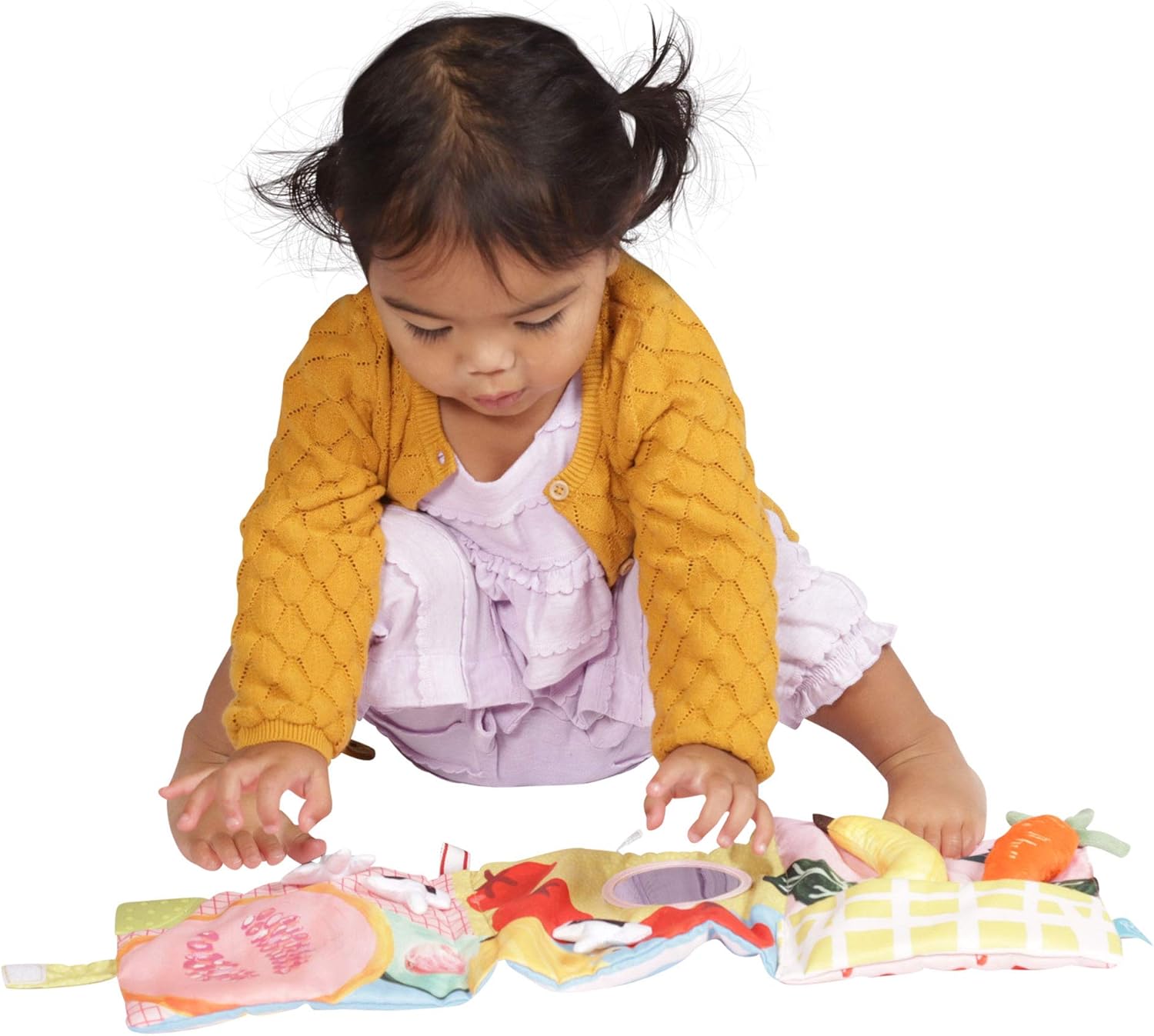 - A BABY TACTILE TOY DELIGHT: The Mini-Apple Farm Soft Activity Crinkle Book is a pure tactile delight. Each page features several fruit and vegetable illustrated shapes and pieces to grasp and explore. The carrot will be especially fun for them to touch and squeeze, due to the soft velour stem and greens.