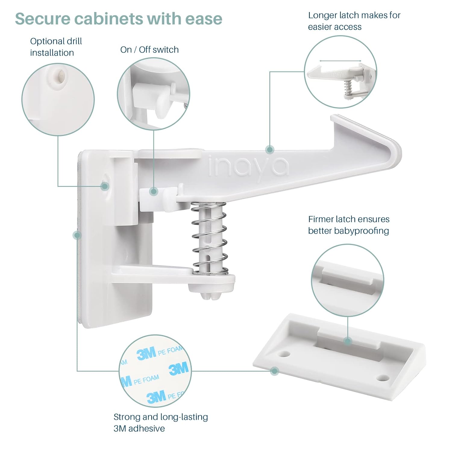 Inaya Cabinet Locks Child Safety Latches - Baby Proofing Cabinets & Drawers Locks - Child Proof Your Home - No Drilling & No Tools Required! (12 Pack - Extended Length Version)
