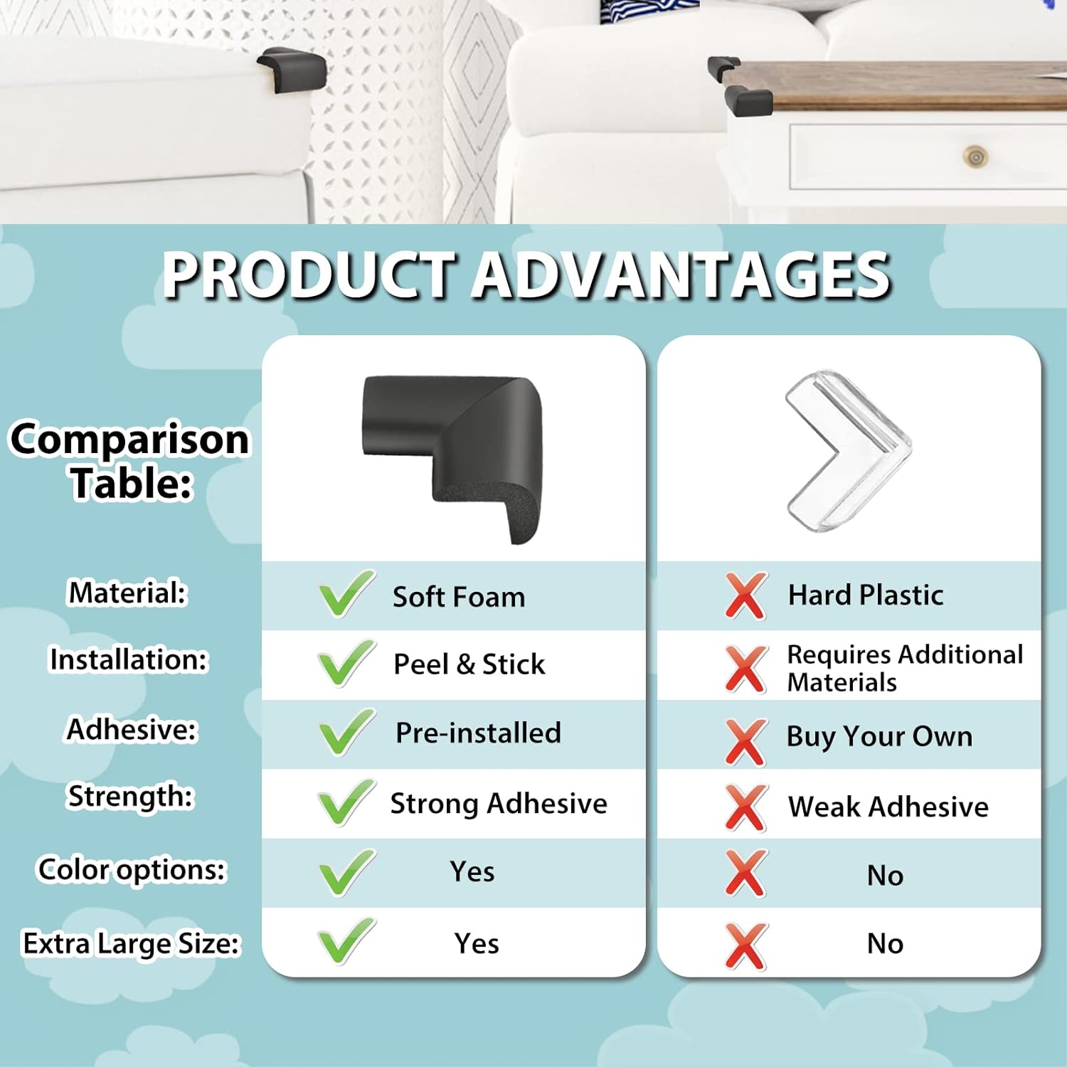 - Easy Installation: All of our baby proofing edge guards are pre-taped.You can just clean the corner of the furniture, tear off the tape, align it with the corner, then stick the edge guards and press it gently. The whole process will take you no more than one minute.