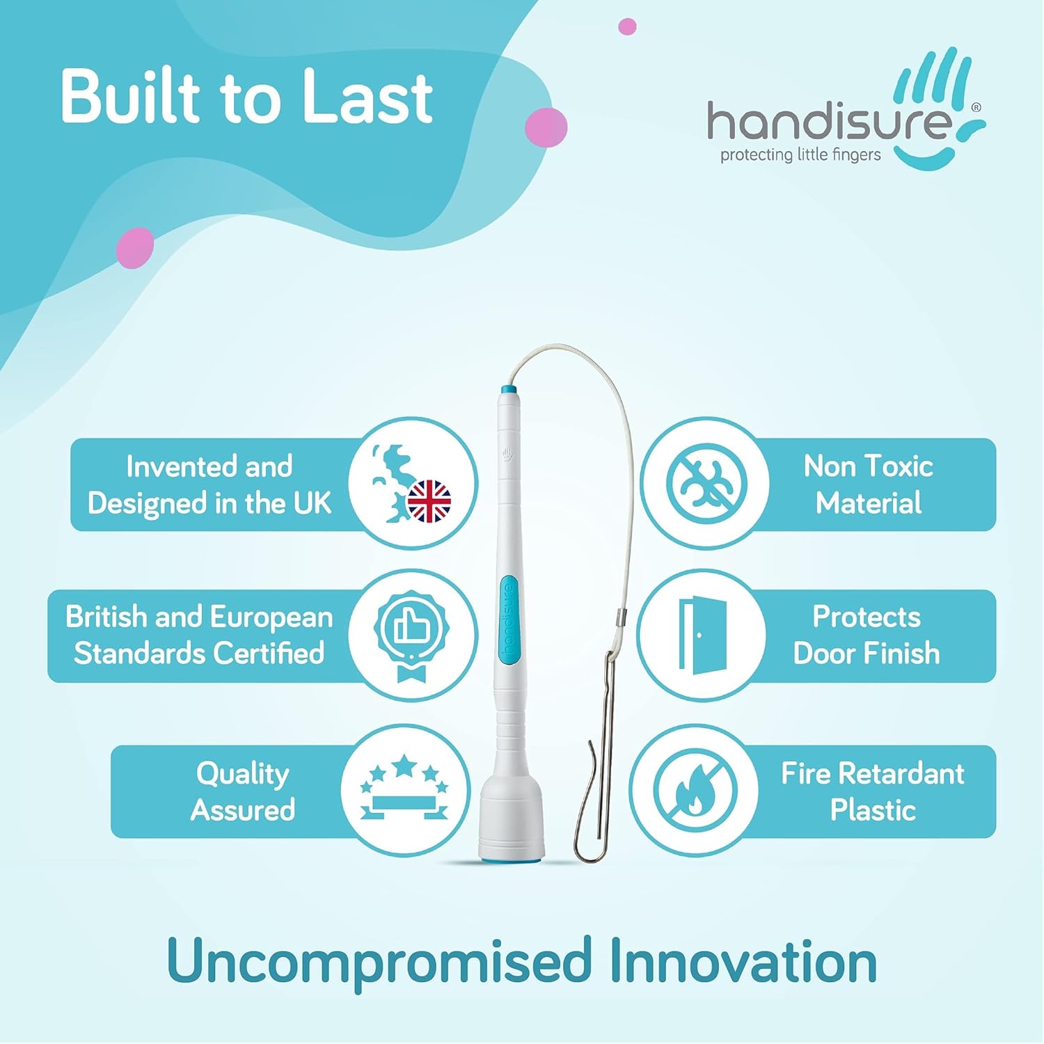 - BEST VALUE FOR PURCHACE: The Handisure finger pinch guard door stopper is the best value for purchase as it provides total protection for your child's fingers from both lock. It is unique in automatically engaging to protect toddlers when they go through the door, and it is reliable, built to last, and has won multiple awards. The Handisure toddler door stopper is British and European standards certified, made of high-quality non-toxic materials, and fits all standard internal doors.