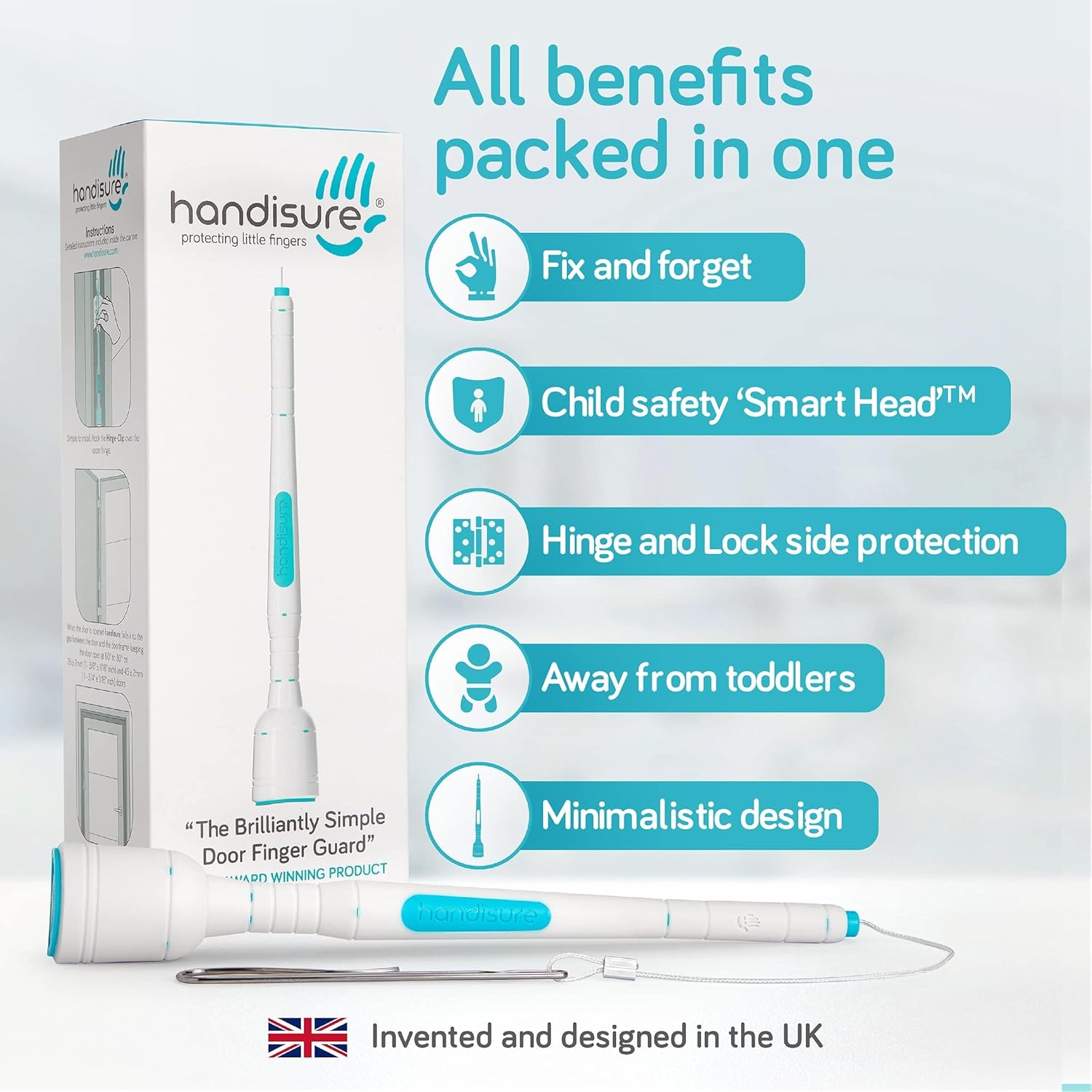 - AUTOMATICALLY ENGAGING DOOR FINGER GUARD: There is no need to remember to place the handisure safety door stopper for babies every time doors are opened. The unique Smart Head of handisure finger pinch guard door stopper kids safety functions to protect when a toddler goes through the door, a benefit not found in other door protector for kids or baby proofing doors slam.Ideal baby proofing door pinch guards and child pr. PEACE OF MIND .