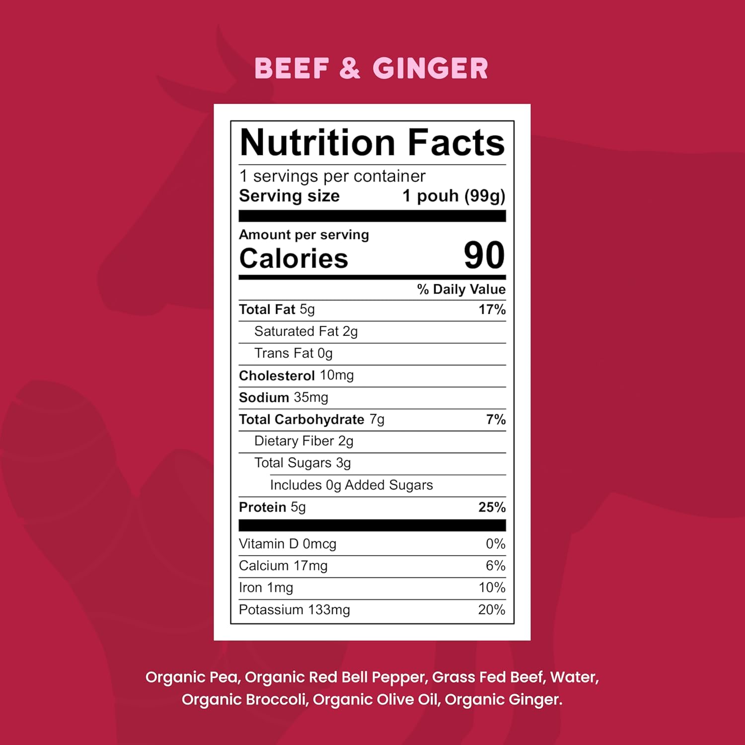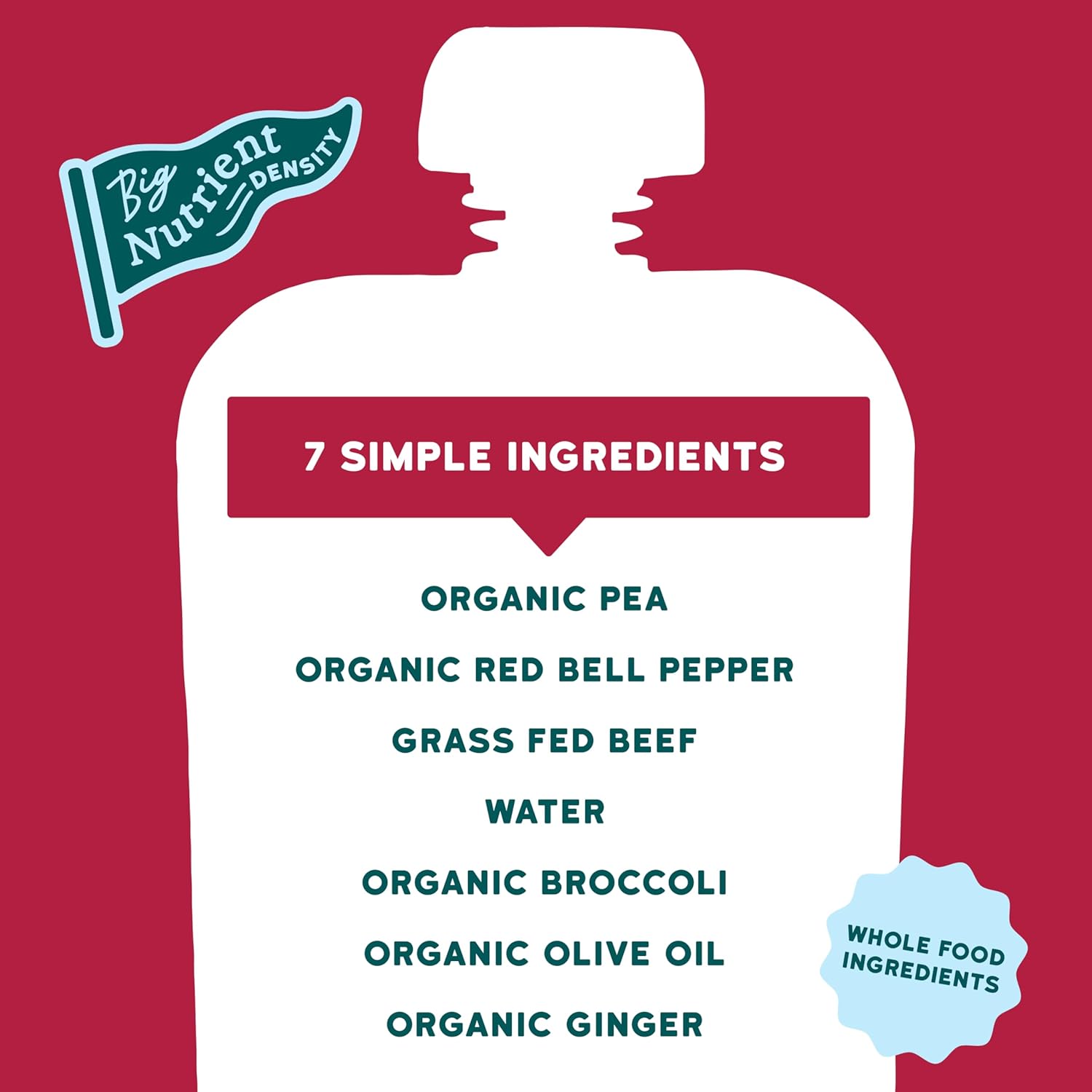 - SAVORY BABY POWER: Dive into 12 pouches of baby food made with grass fed beef, organic peas, bell peppers, and broccoli. A healthy dose of olive oil and organic ginger gives it that extra zing, making it perfect for baby food with meat and toddler food
