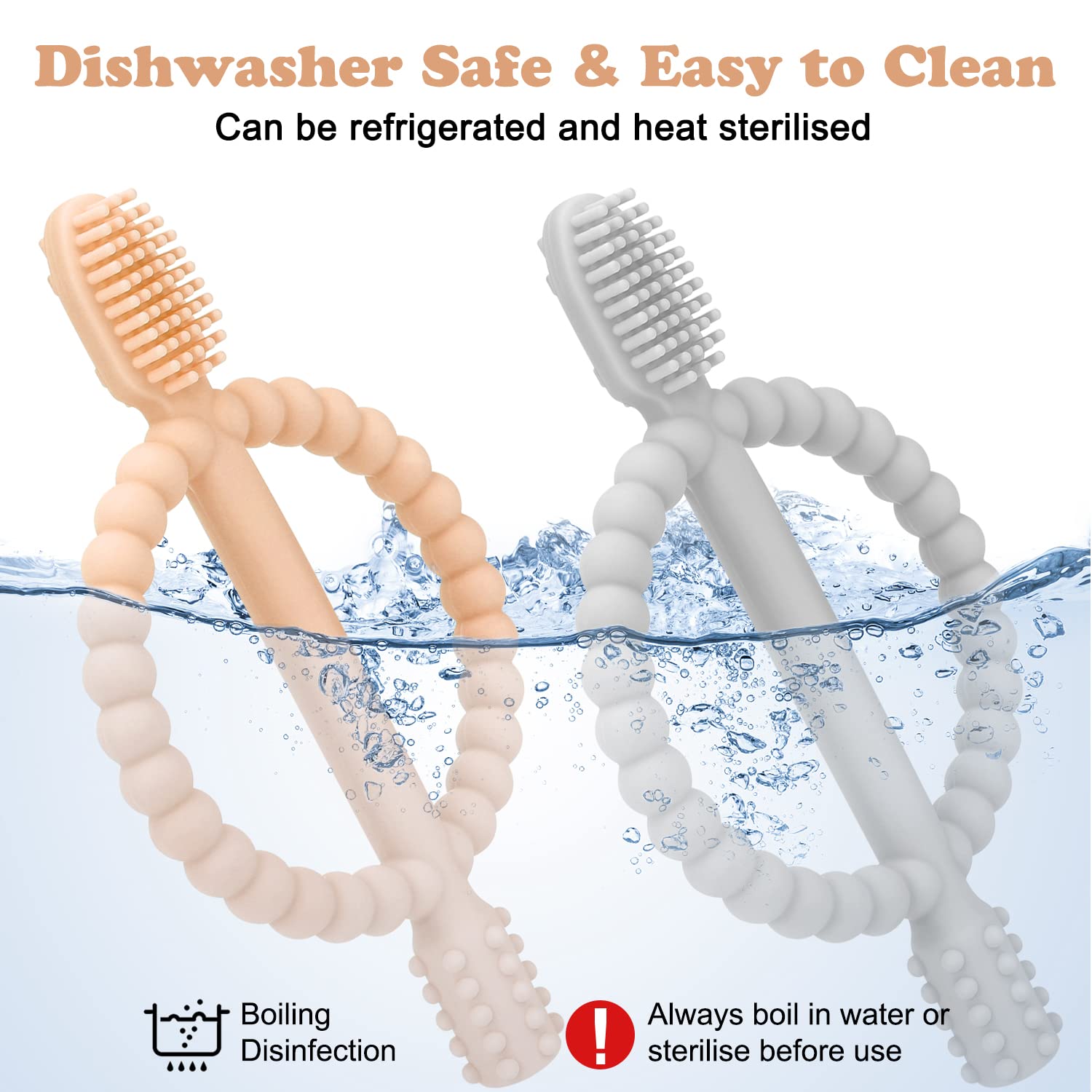 Baby Teething Toys with Easy-Hold Handle, Silicone Infant Toothbrush, Textured On Both Sides Helps Massage, Soothe Sore Gums, Teething Toys for Babies 0-6 Months, 6-12 Months Peach Powder & Gray