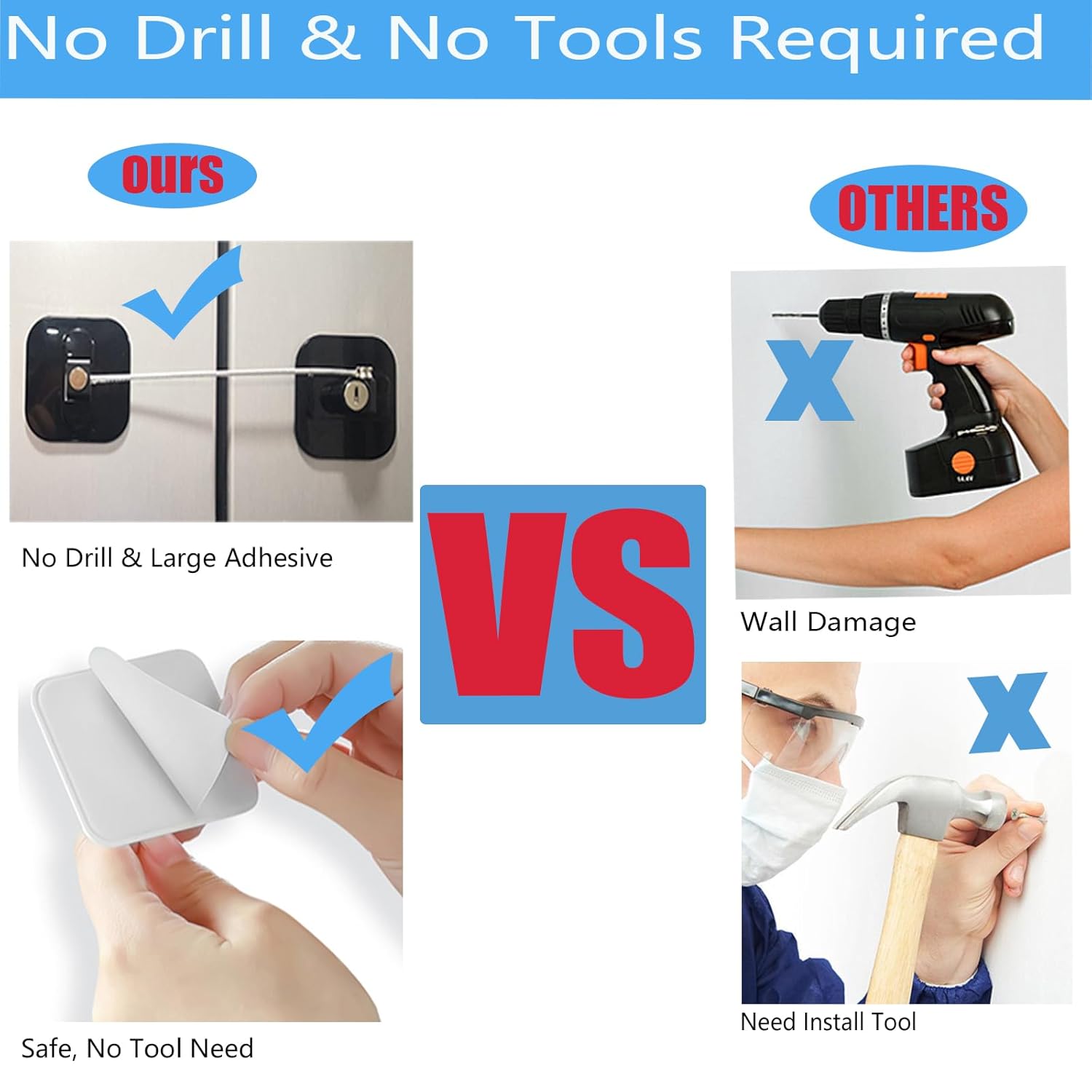 - EASY INSTALLATION NO SCREWS REQUIRED: Keep the fridge door surface clean and dry, Then peel off the back of the refrigerator lock adhesive and stick it on the surface, Baby proof mini fridge lock will instantly stick to smooth surfaces, No drilling tools are needed (Press the stick bases on mini fridge accessories for seconds, Can not pull the fridge lock within 24 hours)