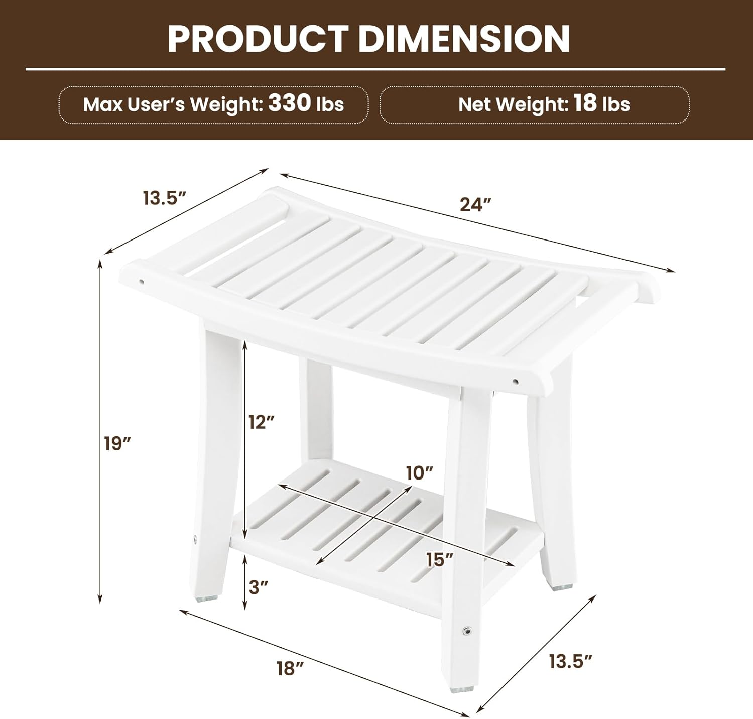 - Durable & Sturdy Construction: The 2-tier shower bench is made of high quality HDPE material which is durable and waterproof, rendering it suitable for long-term use in the bathroom. Besides, the sturdy structure with rustproof screws enables the top shelf to hold up to 330 lbs.