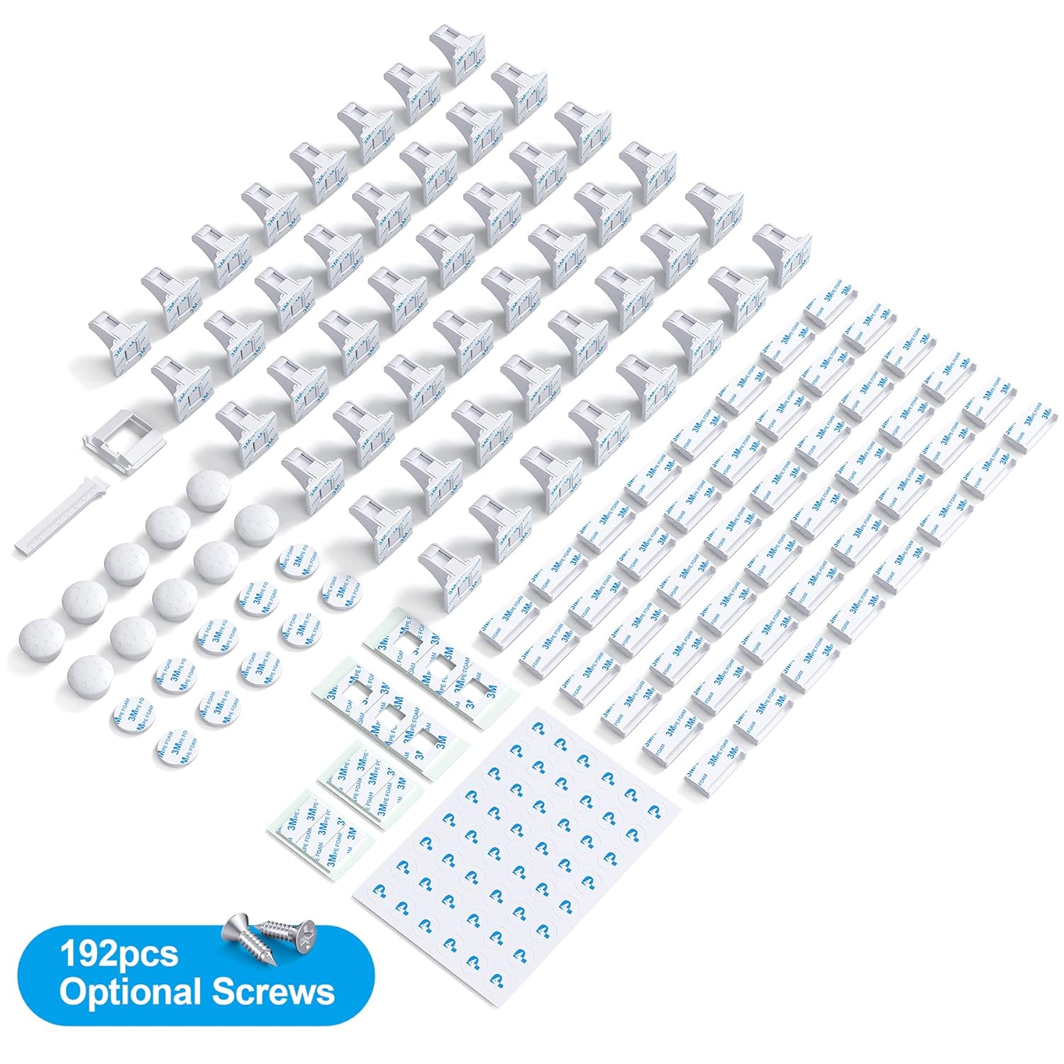 - ✔48locks+10keys: Total 48Locks with 3M tapes, 10Keys with 3M tapes, one installation cradle, one installation ruler, extra 12pcs 3M tapes, optional 192pcs screws, 48pcs position stickers.