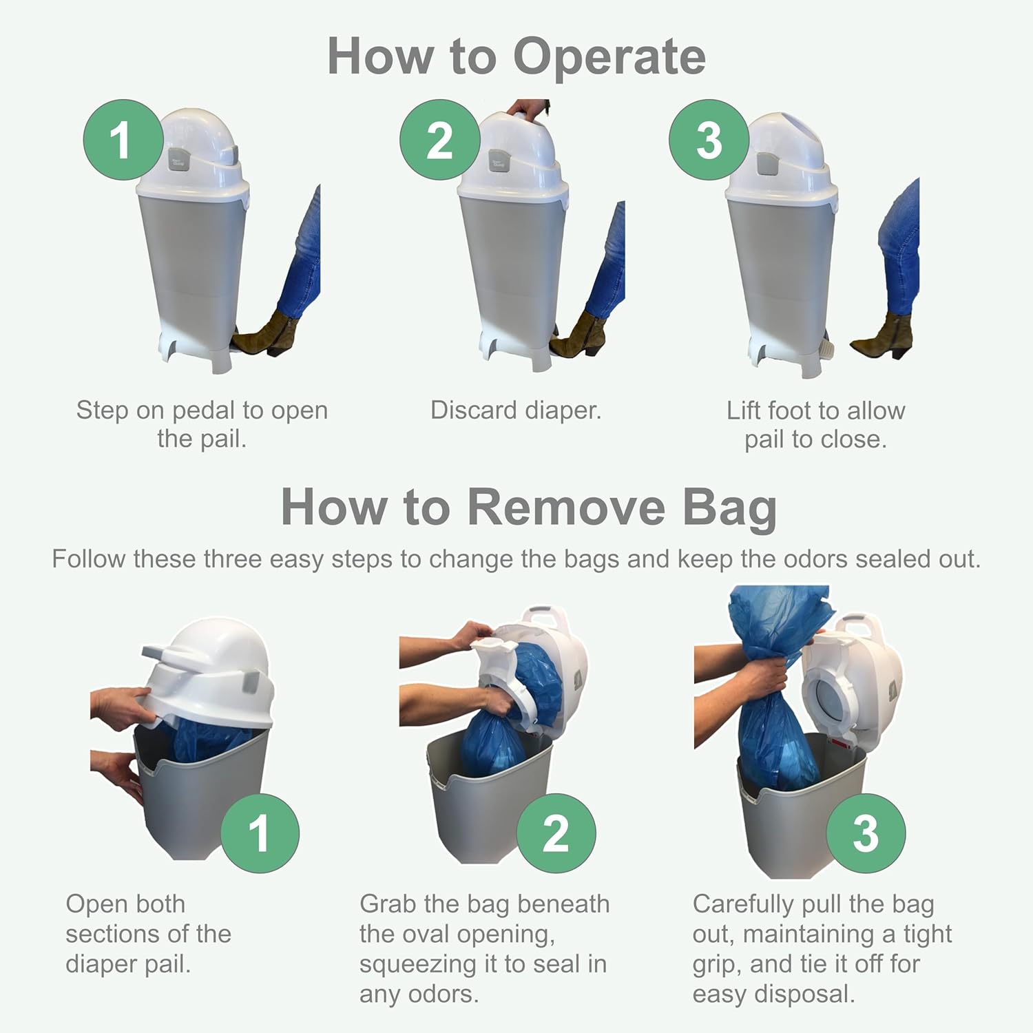 - Hands-Free Operation: Simply step on the foot pedal to reveal the sealed compartment, drop the diaper in, and release the pedal. The weighted mechanism will automatically drop the diaper into the bag, securely containing both the diaper and odor with ease.