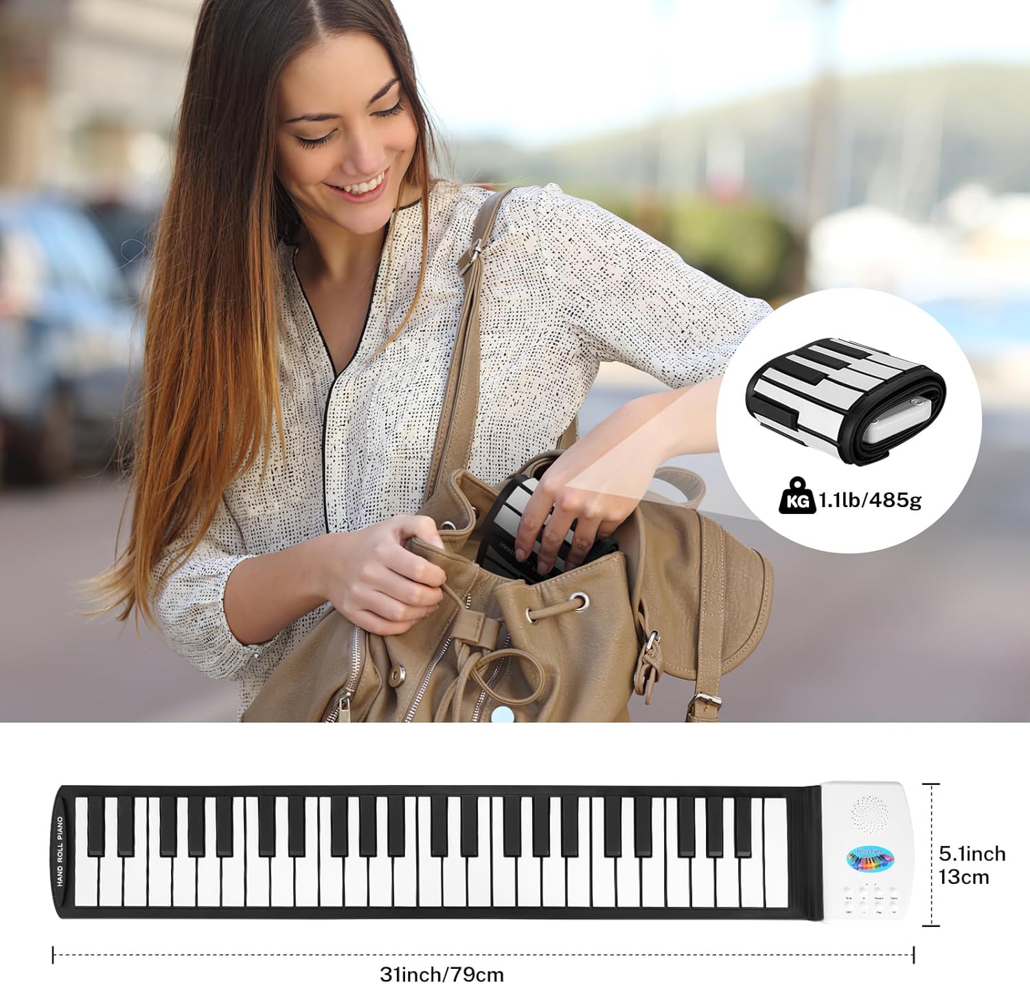 - ROLL UP DESIGN & PORTABLE & RECHARGEABLE --- The soft piano mat is portable and flexible. Easily unfold when playing, roll it back into the box or backpack after playing, it saves space and is easy to store. Easy to carry, you can take it anywhere and start playing with friends/family. Built-in rechargeable battery, you can charge it anytime.