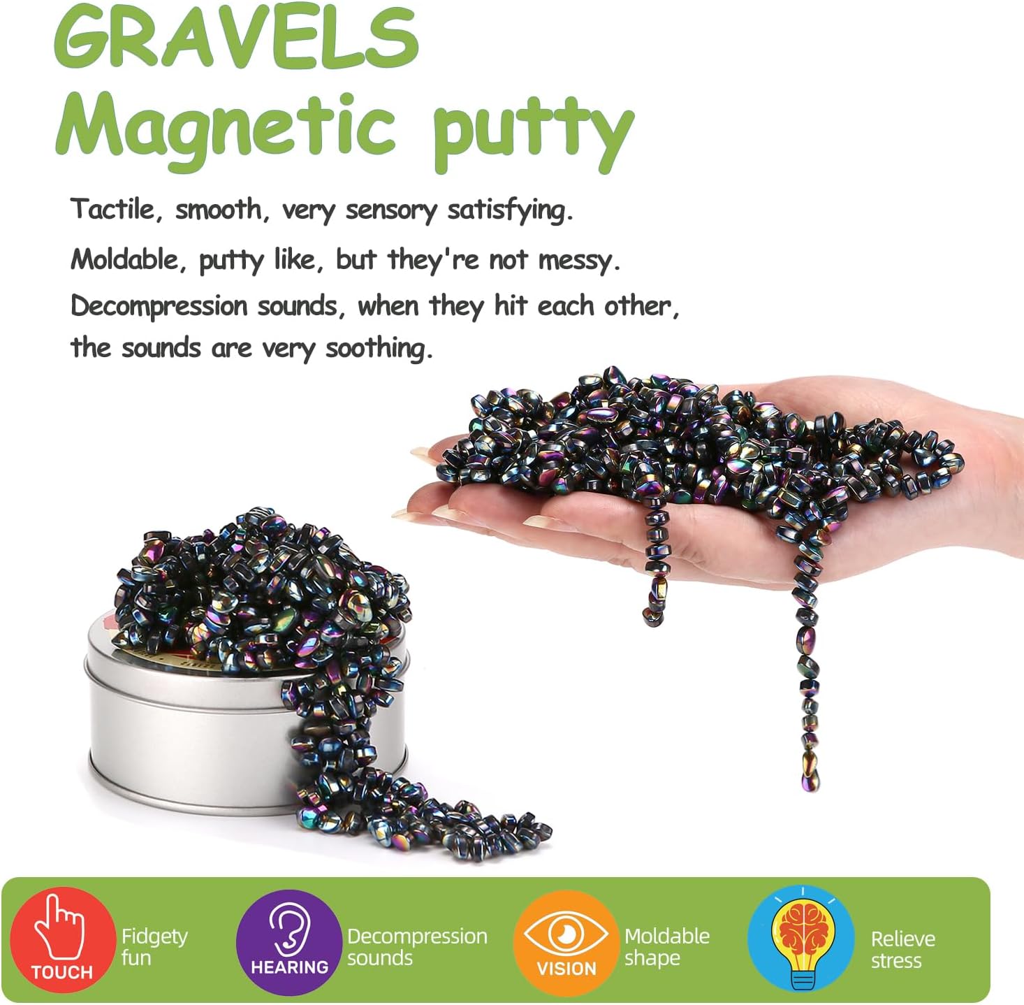 - Desk Toys Features: Smooth and irregular small particles, like puddy, are attracted to each other. The size of each is about 0.7cm, and it is hand-polished. It is almost impossible to find 2 pieces that are exactly the same. The quantity in a box is about 550 PCS putty, which is enough to play.