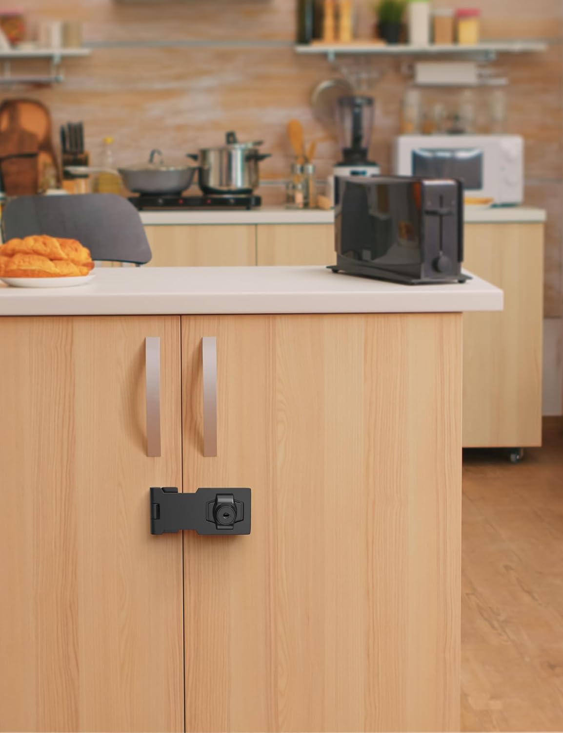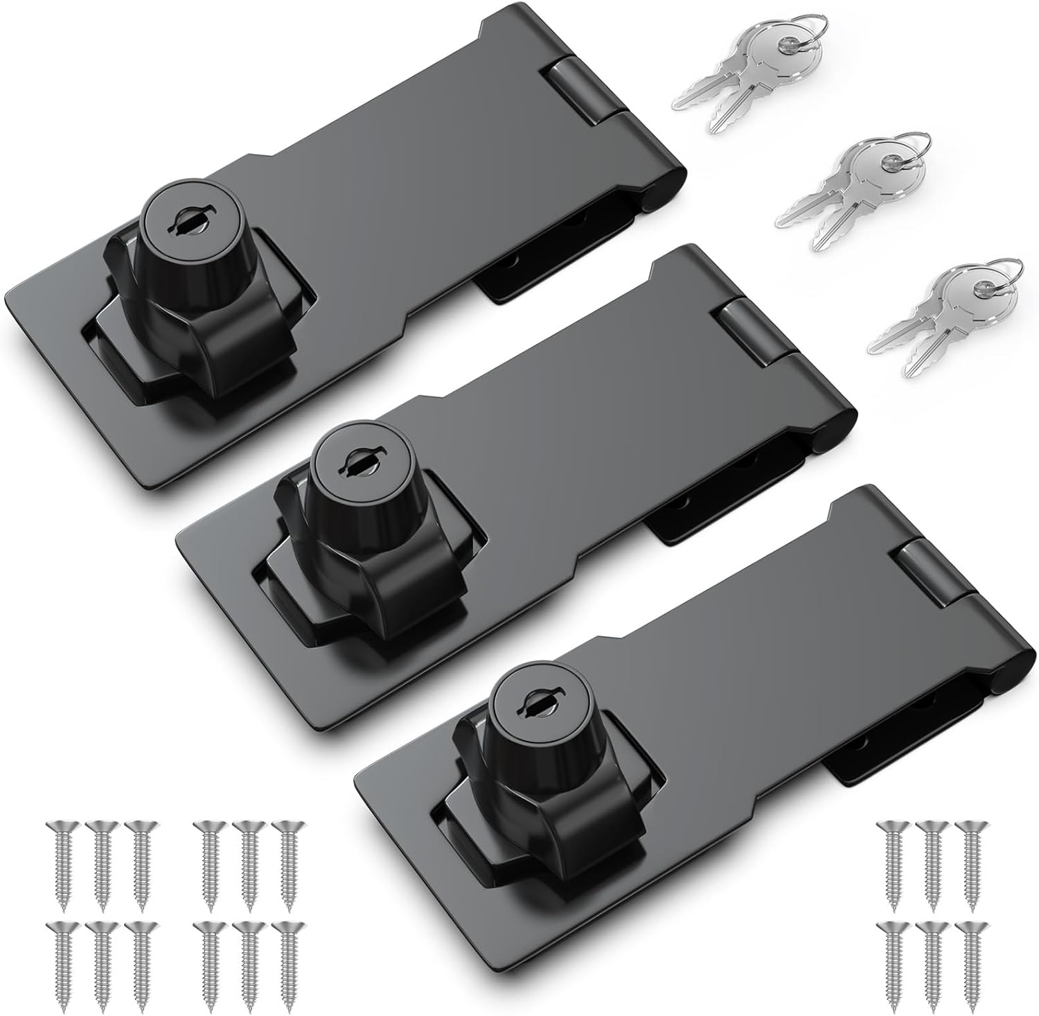 4 Inch Keyed Hasp Lock for Cabinets & Small Doors, Twist Knob Design, Heavy Duty Zinc Alloy with Chrome-Plated Iron, Includes Keys & Screws - Black, 3 Pack