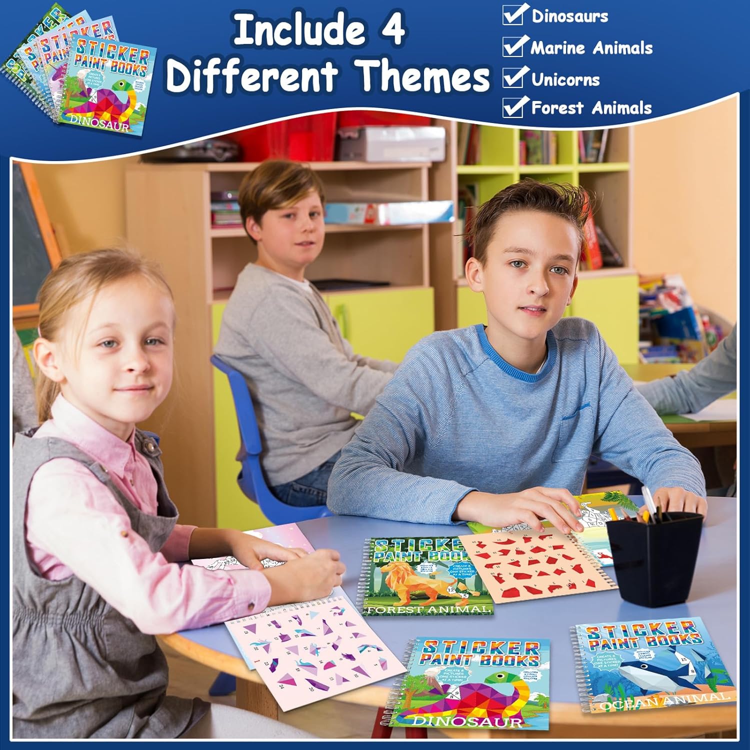 - ăSticker Paint Books for KidsăPaint by sticker set consists of 4 books for kids 4-8, each containing 8 pages of unique images. In total, there are 32 pictures for you to complete. The book themes encompass dinosaurs, marine animals, forest animals, and unicorns. With a diverse range of themes and an abundant supply of stickers, this set is guaranteed to fulfill all your creative requirements.