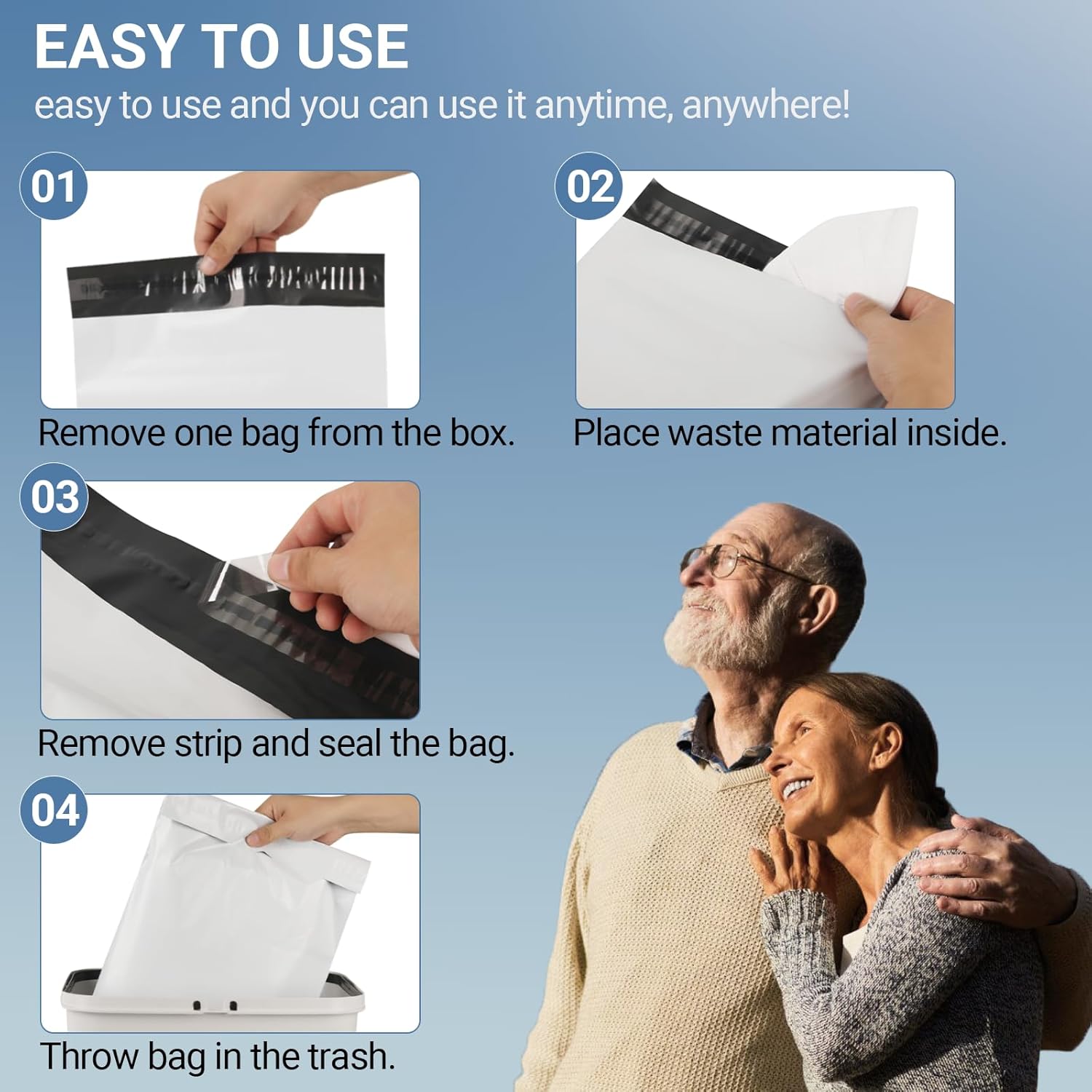 - Reliable Sealing: Say goodbye to unsightly messes and unwanted odors with our adult diaper disposal system. These disposal bags feature adhesive seals that effectively eliminate leaks, ensuring a secure and hygienic disposal solution wherever you go. No more worries about spills or odors.