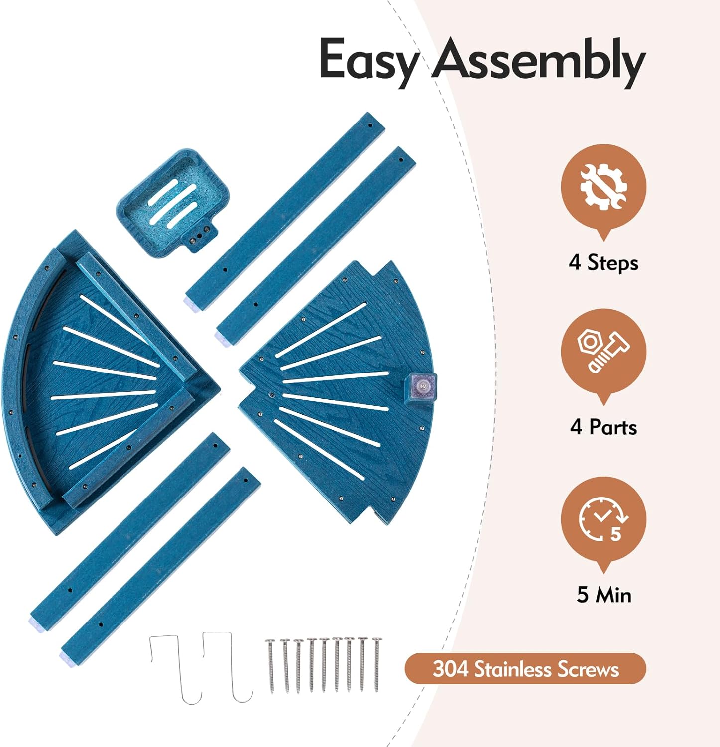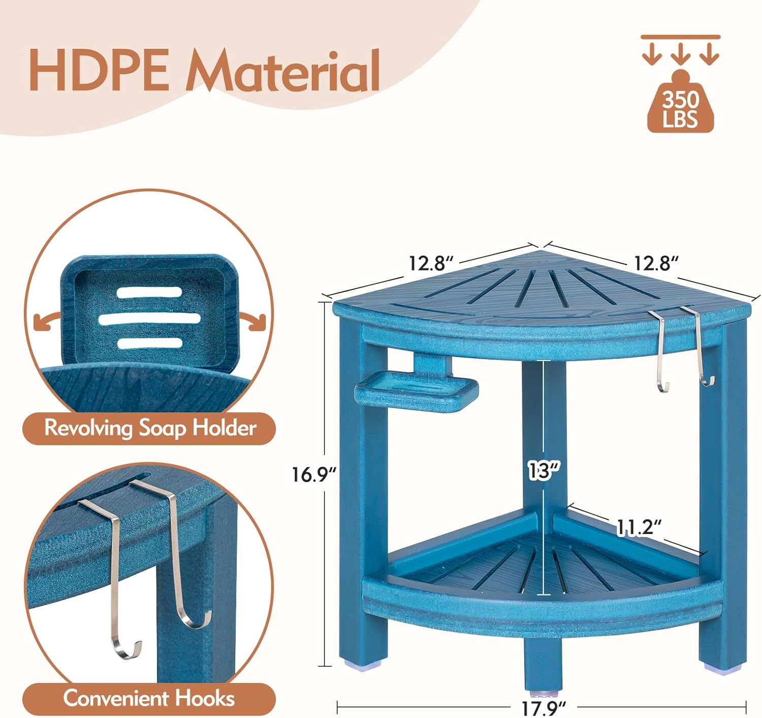 2-Tier Corner Shower Stool with Hooks & Soap Dish, HDPE Shower Bench for Shaving Legs, Wood-Like Shower Stool for Inside Shower with Non-Slip Foot Pads, Waterproof Shower Foot Rest (Blue)