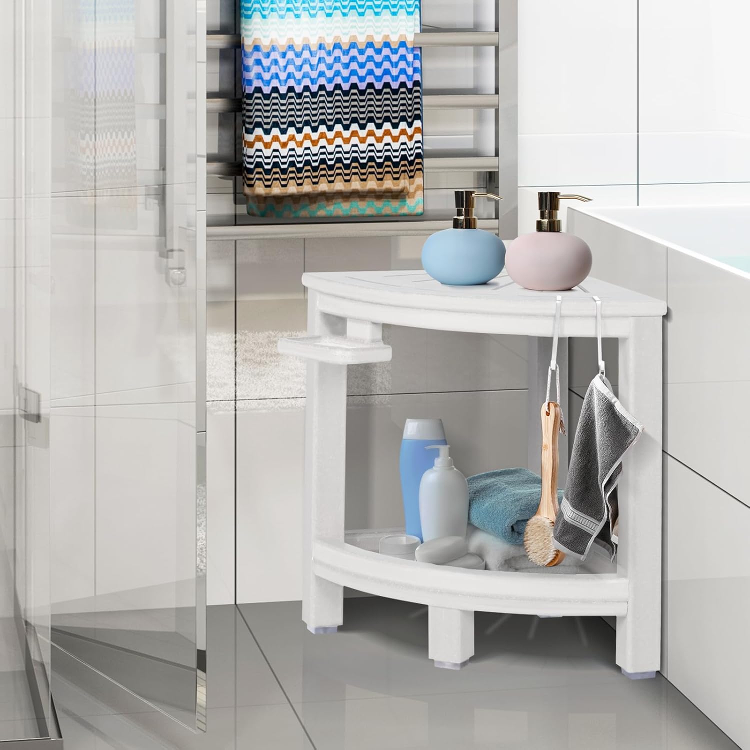 2-Tier Corner Shower Stool with Hooks & Soap Dish, HDPE Shower Bench for Shaving Legs, Wood-Like Shower Stool for Inside Shower with Non-Slip Foot Pads, Waterproof Shower Foot Rest (White)