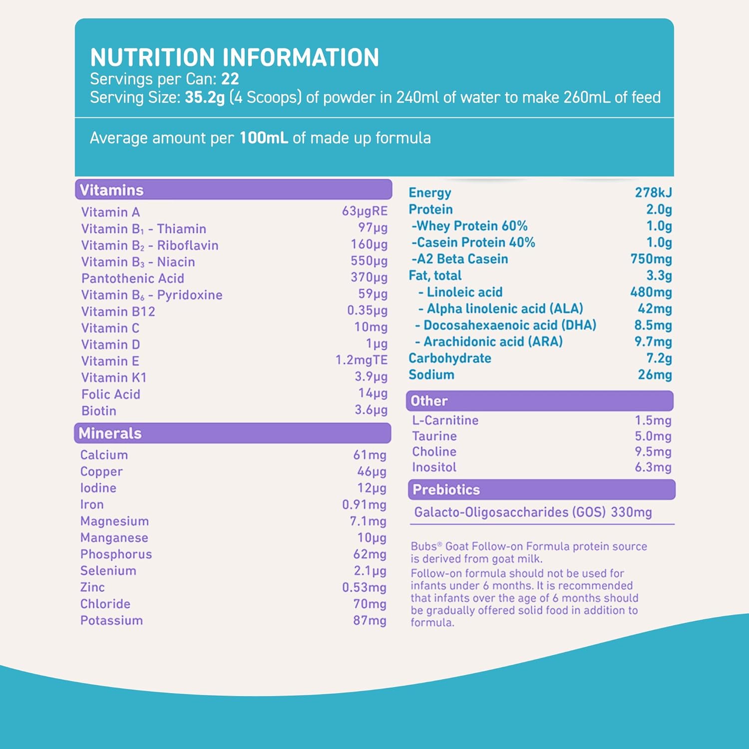 - NATURALLY GENTLE: Bubs Goat Milk Follow On Formula Stage 2 is an Australian Made baby formula exclusively formulated for sensitive tiny tummies ages 6-12 months feeding 4 times per day, all while made to ensure safety, quality, purity, and nutrition