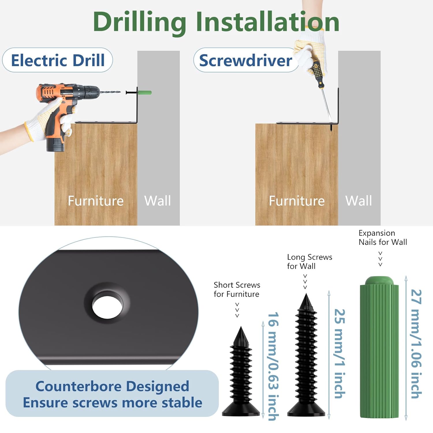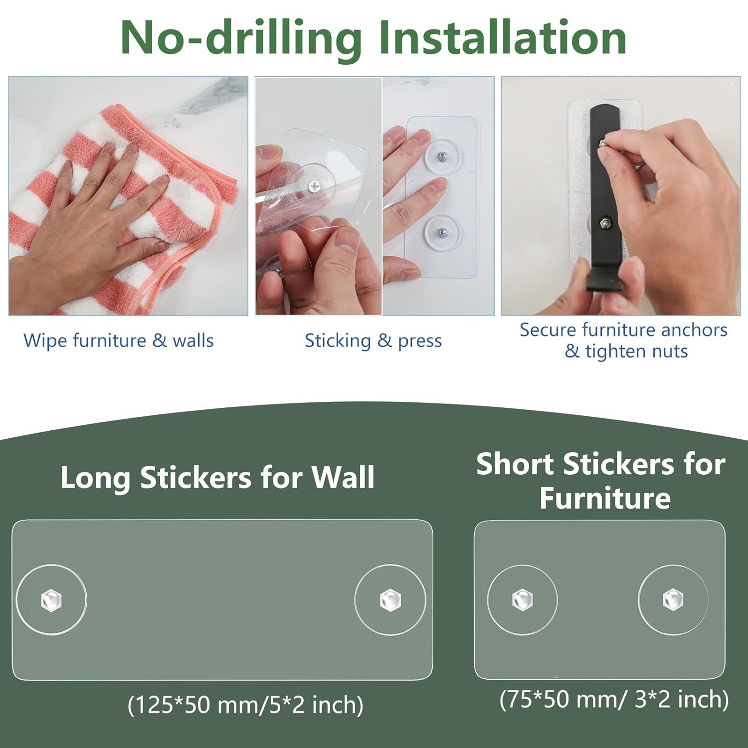 - [2 INSTALLATION WAYS]: The anti tip furniture anchors can be installed in two ways: drilled installation with strong fastening force for rough wall surfaces; no-drill installation using customised no-nail stickers, which have stronger adhesion without hurts to wall, more convenient to install and dismantle, suitable for smooth wall surfaces.
