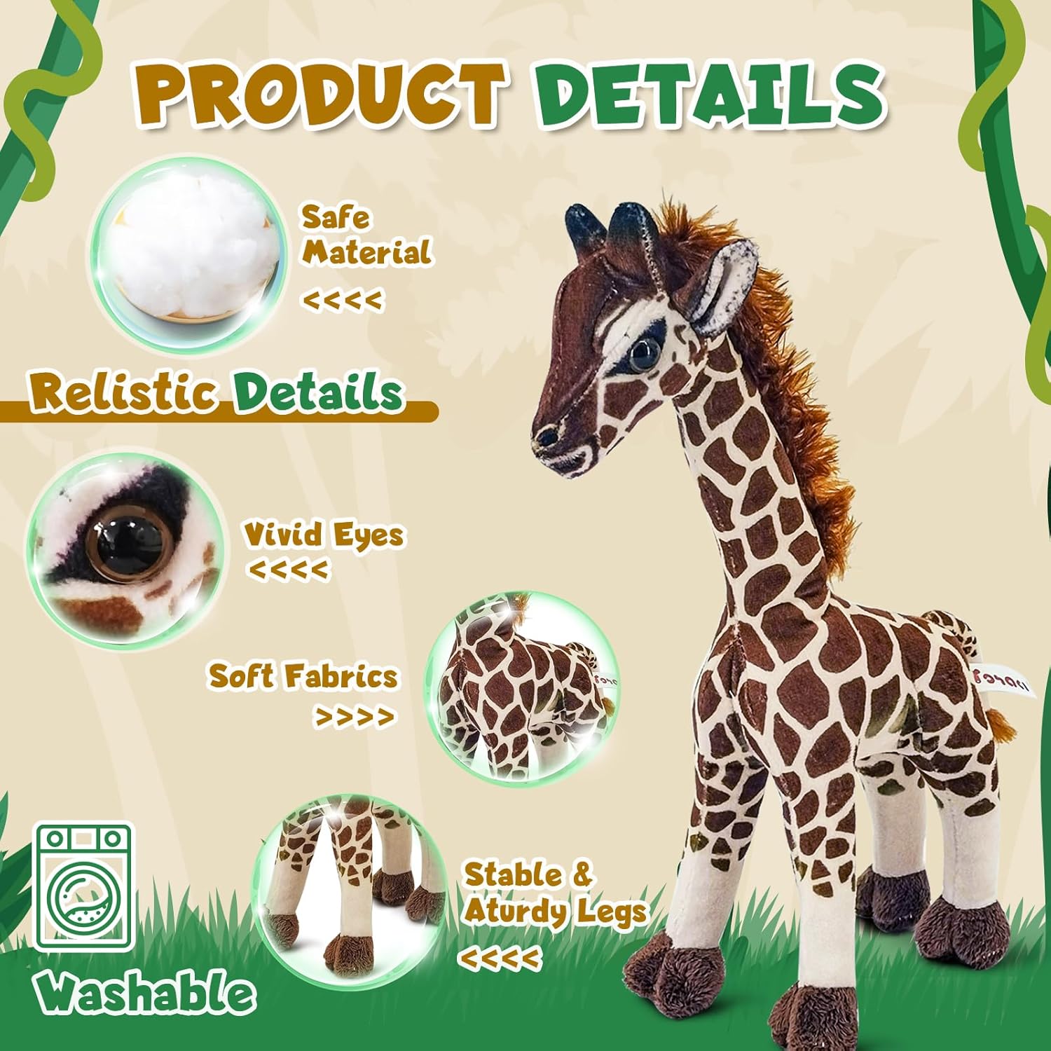- Soft Plush Fabric: This giraffe plush toy is made of soft, high-quality material, featuring premium soft plush fabric, washable.