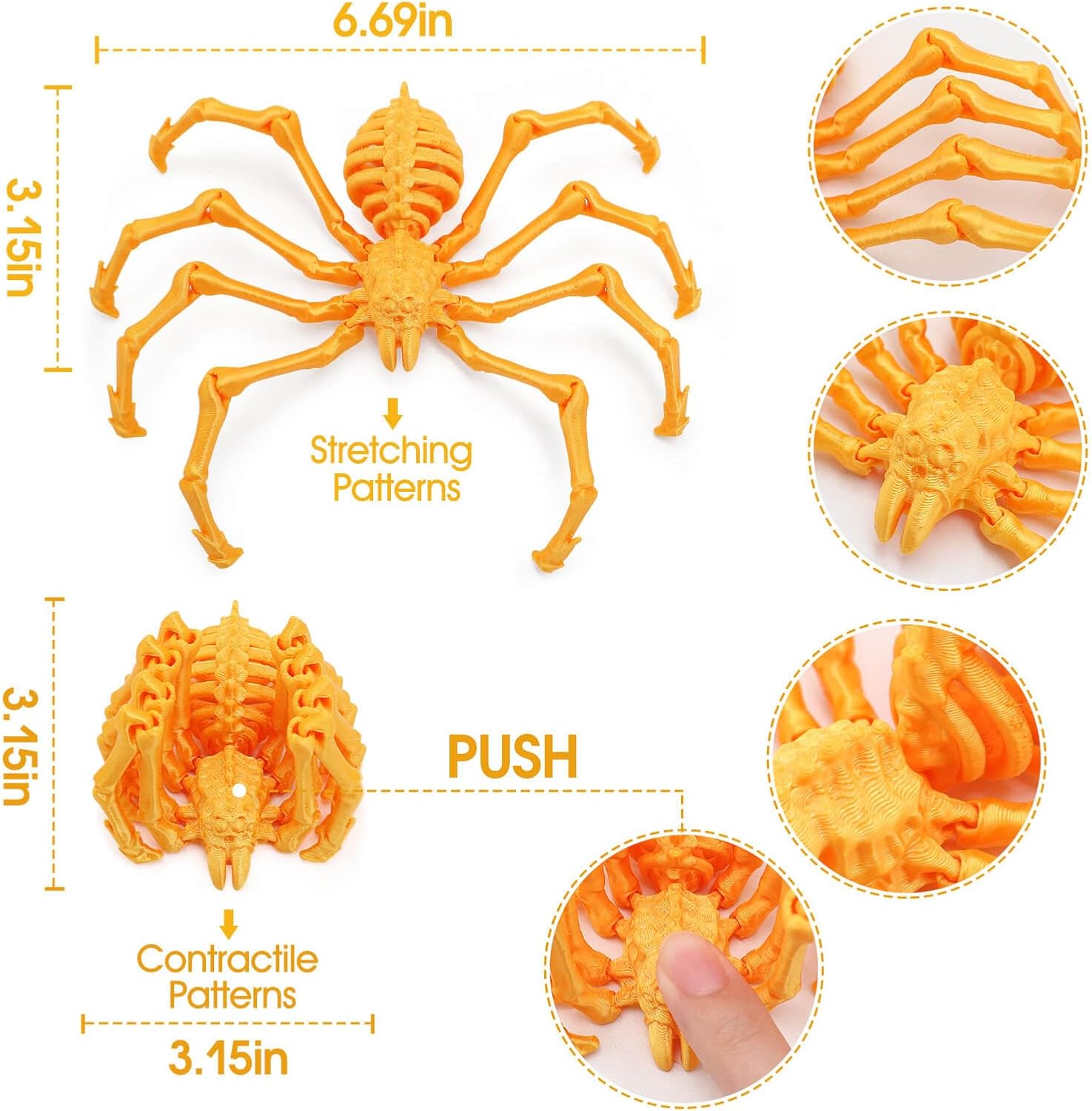 - 【Stress Relief Fidget Toys】: This 3D printed spider's leg and waist joints are swingable, and its articulated nature allows for stress-relieving activities such as joint wobbling, stretching extension, and pressing to shrink, providing a satisfying outlet for anxiety and stress, suitable for relaxing the brain and helping to reduce stress and focus. Note: Age is 8 years old and above to use.