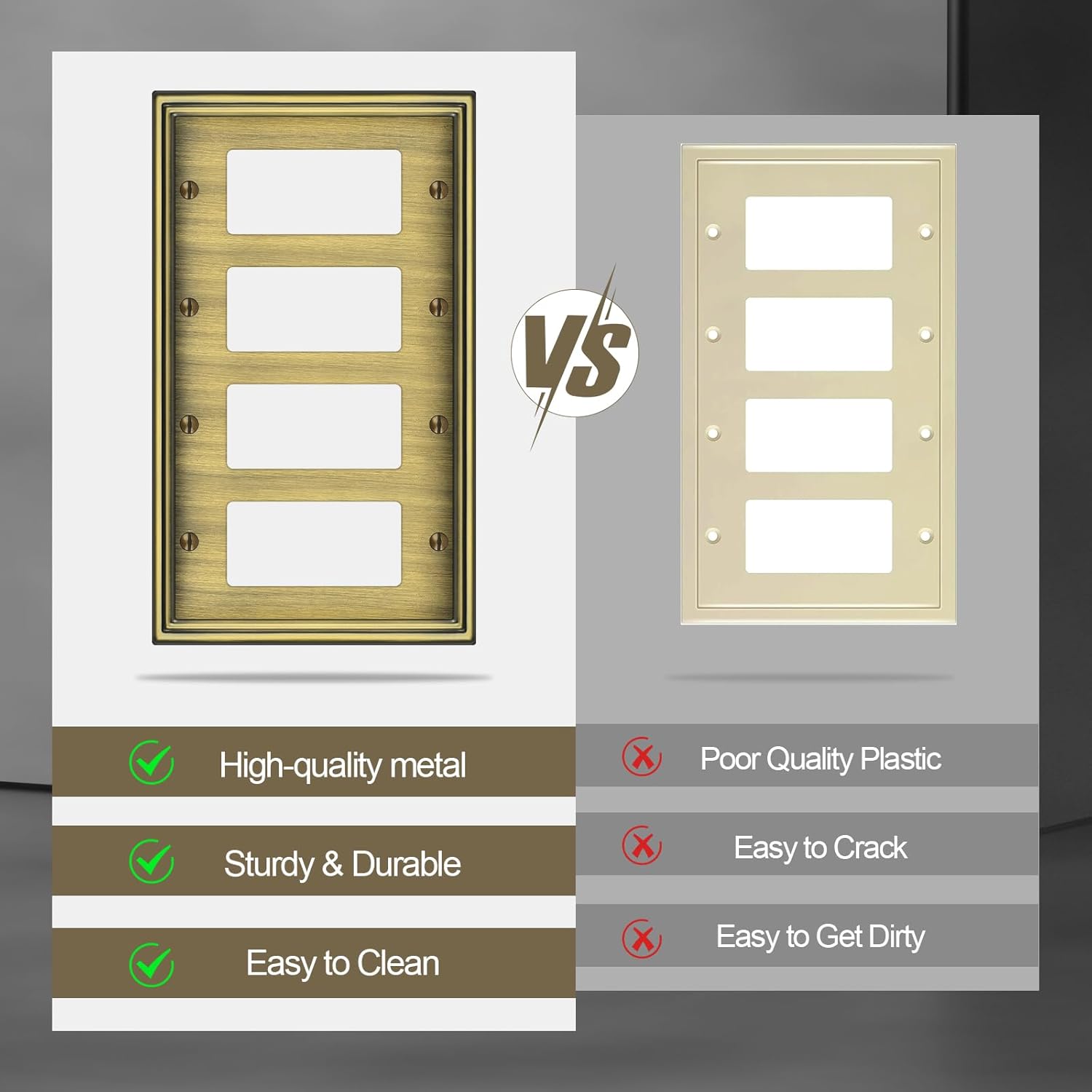 - 【Good Surface Finish】Wall plates surface using electroplating process, which will form an extra layer of dense metal on the surface of the original metal material. It makes the surface smoother and the color more uniform, and the plating has strong adhesion, not easy to fall off and aging, effectively extending the service life of the metal.