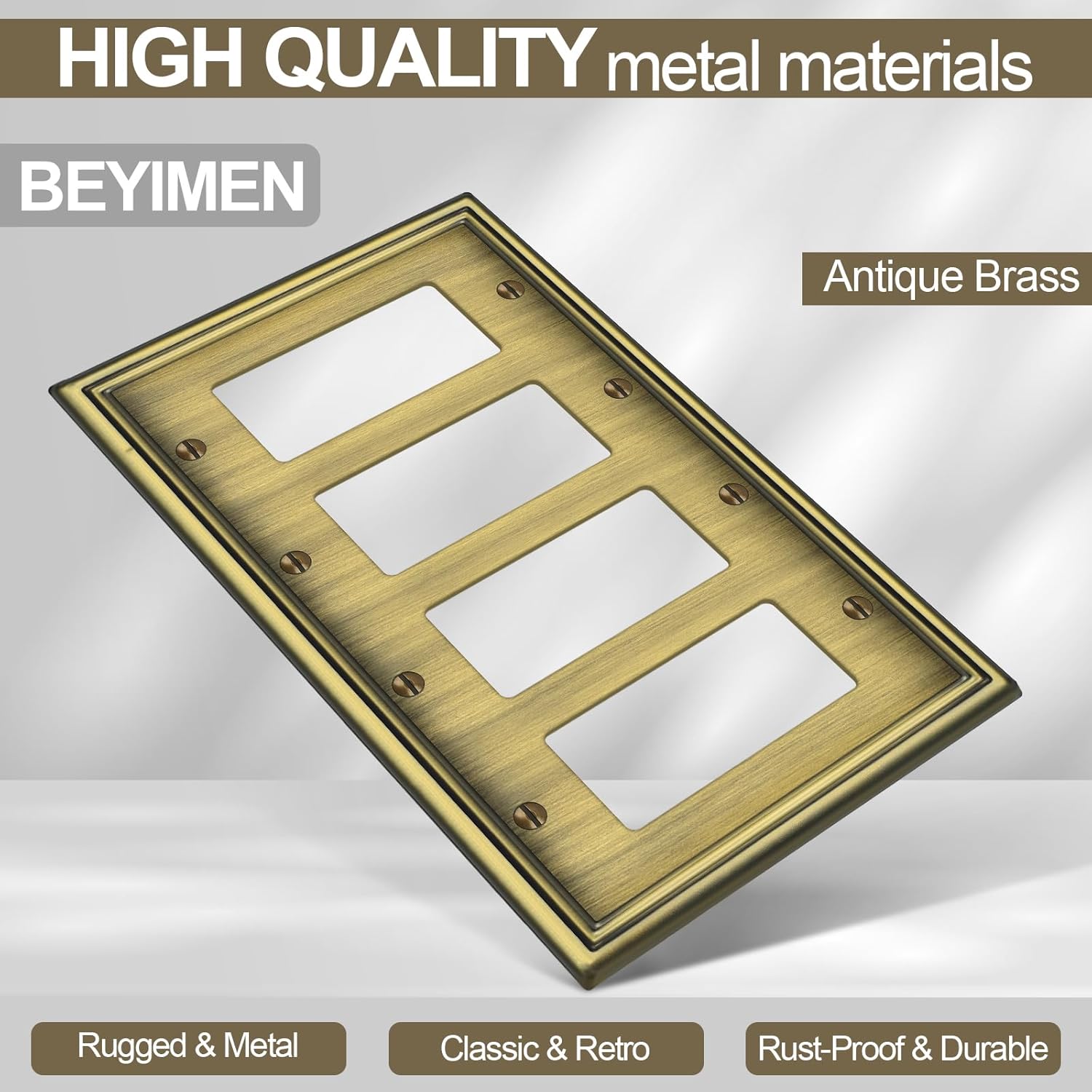 2 Pack Quad Decorator Switch Covers Wall Plate, Antique Brass Metal Material Rocker Switch Plates, 4 Gang Wall Plate for Receptacle, GFCI Outlet, Dimmer Switch - Classic Style