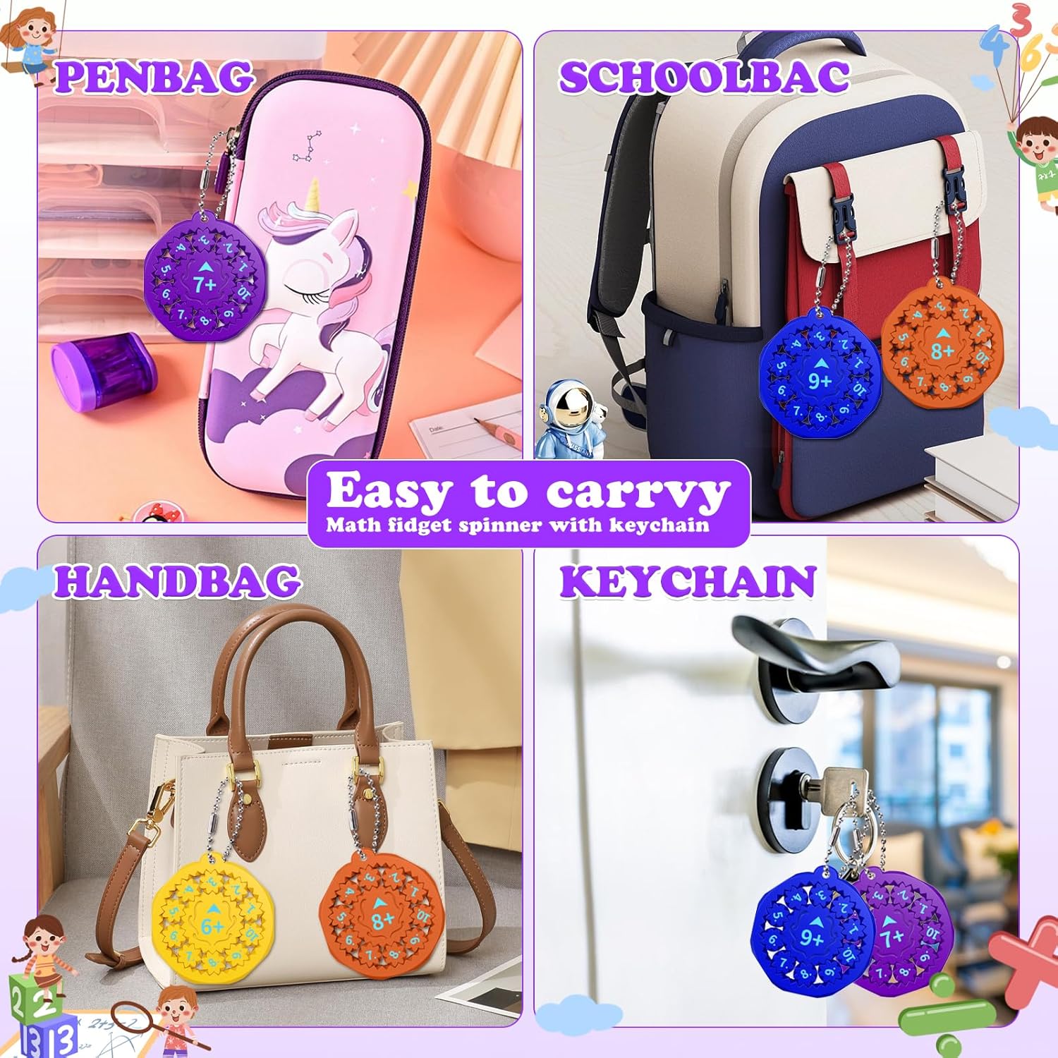 - 【Portable Spinner&Keychain】Our fidget spinner toys are not only compact and highly portable but also feature the advantage of being compatible with keychains. This allows them to be easily attached to backpacks, bags, or carried alongside keys, ensuring that children can engage in math learning conveniently at home, in transit, at school, or wherever they go. With our portable math fidget spinners, every moment and place becomes an enjoyable opportunity for interactive math exploration!