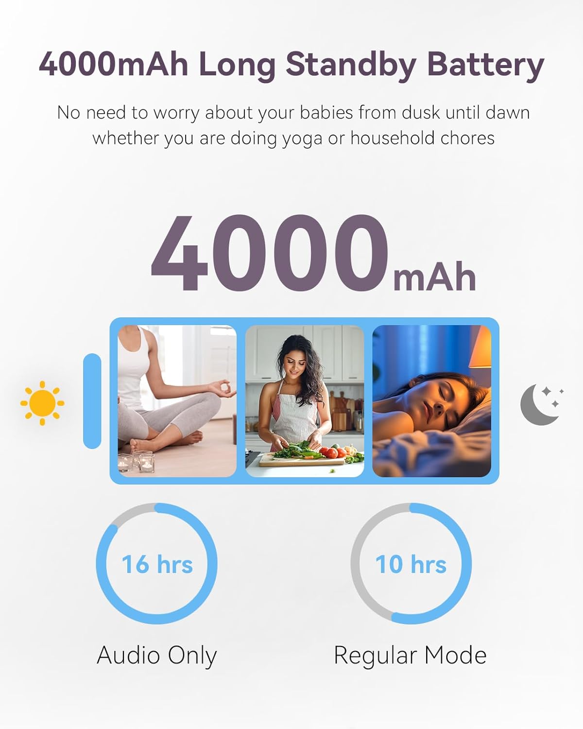 - ăUp to 10 Hrs. Regular mode or 16 Hrs Vox mode on Single Chargeă: With 4000mAh rechargeable battery you can get up to 10 hours of video streaming or up to 16 Hrs of Audio only, allowing you to easily monitor your baby throughout the night or full day on one charge.