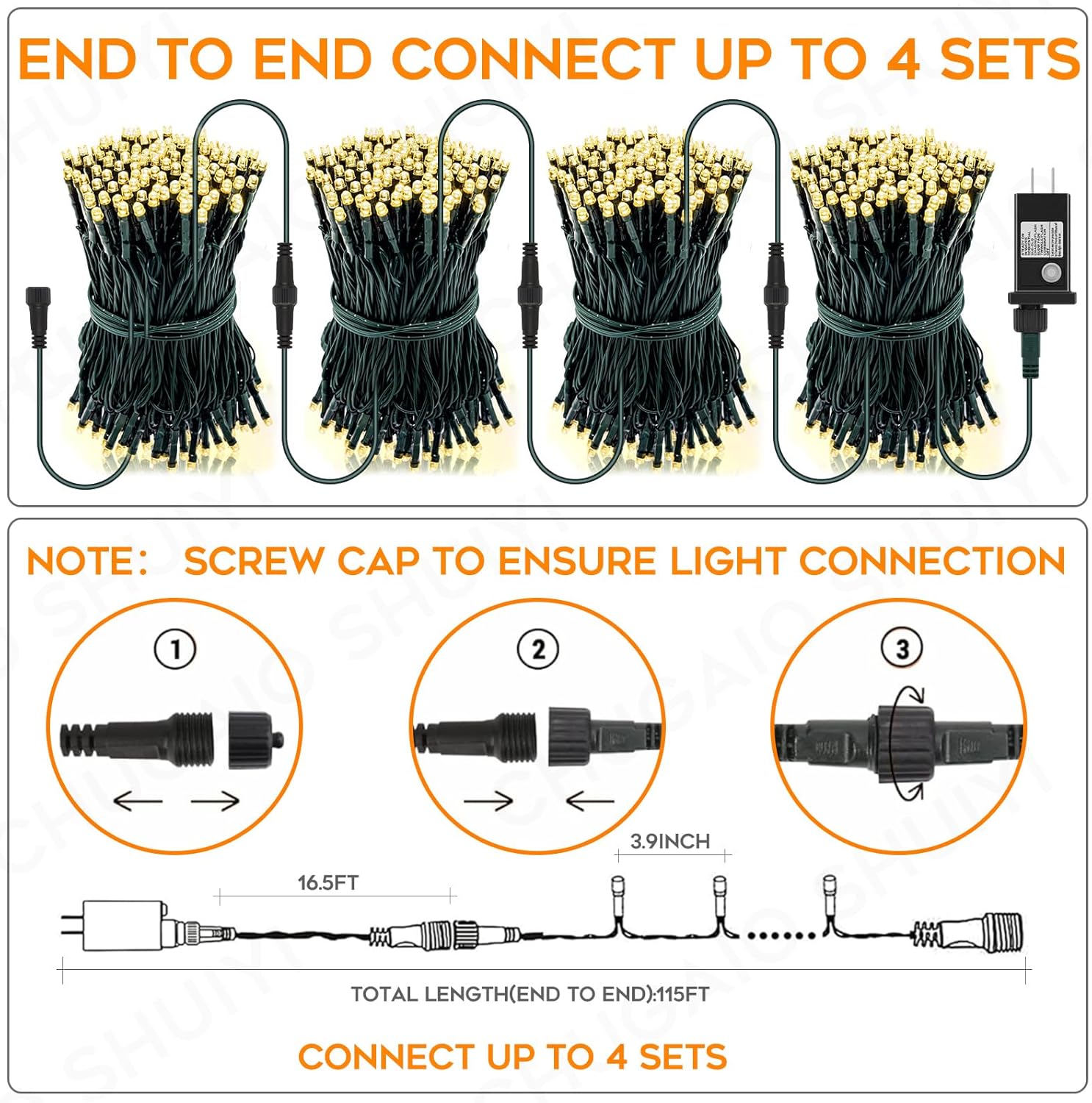 - Xmas String Lights with End Connection: Connectable: The LED Christmas tree lights come with male and female connectors, allowing them to be connectable to a maximum of 4 interconnected light strands (up to 800 LED in total). With a 10 ft lead wire, there's no need to worry about the distance between the power plug and the area you want to decorate.