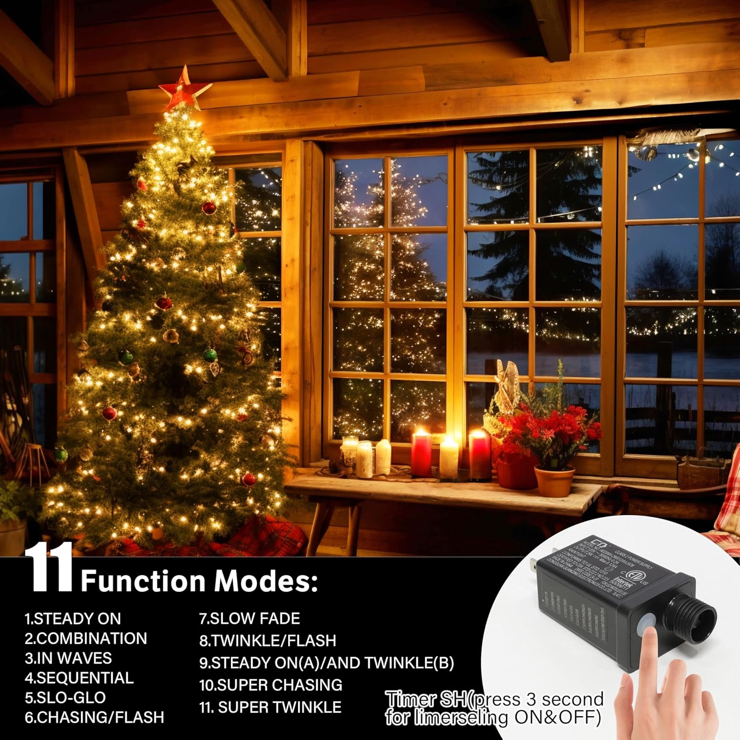 - 11 lighting modes: combination, in waves, sequential, slogs, chasing/flash, slow fade, twinkle/flash, and steady on. Fit different occasions, moods, feelings, holidays, festivals, anniversaries, etc. Pressing the round button on the transformer to change the lighting modes.