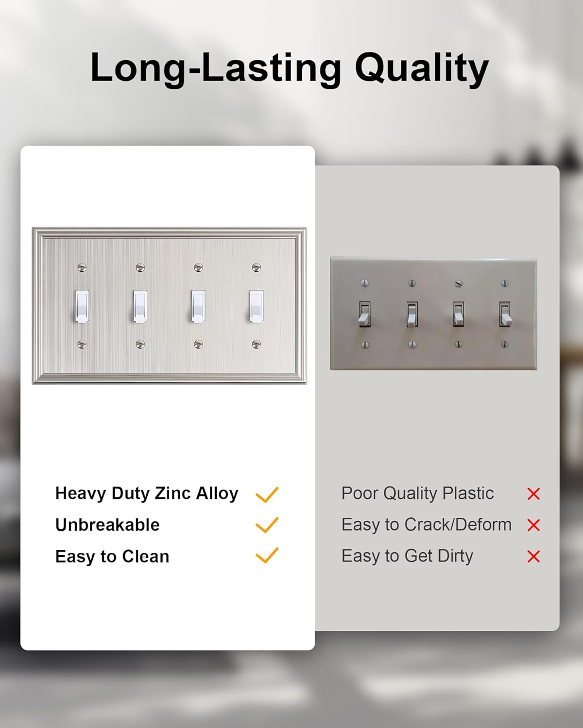 - Durable Solid Zinc Alloy - Constructed from thick and sturdy zinc alloy, the light switch cover plate offers exceptional durability and sturdiness, easier to clean and maintain. It is resistant to high impact, tarnishing, and corrosion, unbreakable. Ensuring it remains its stunning appearance for years to come.