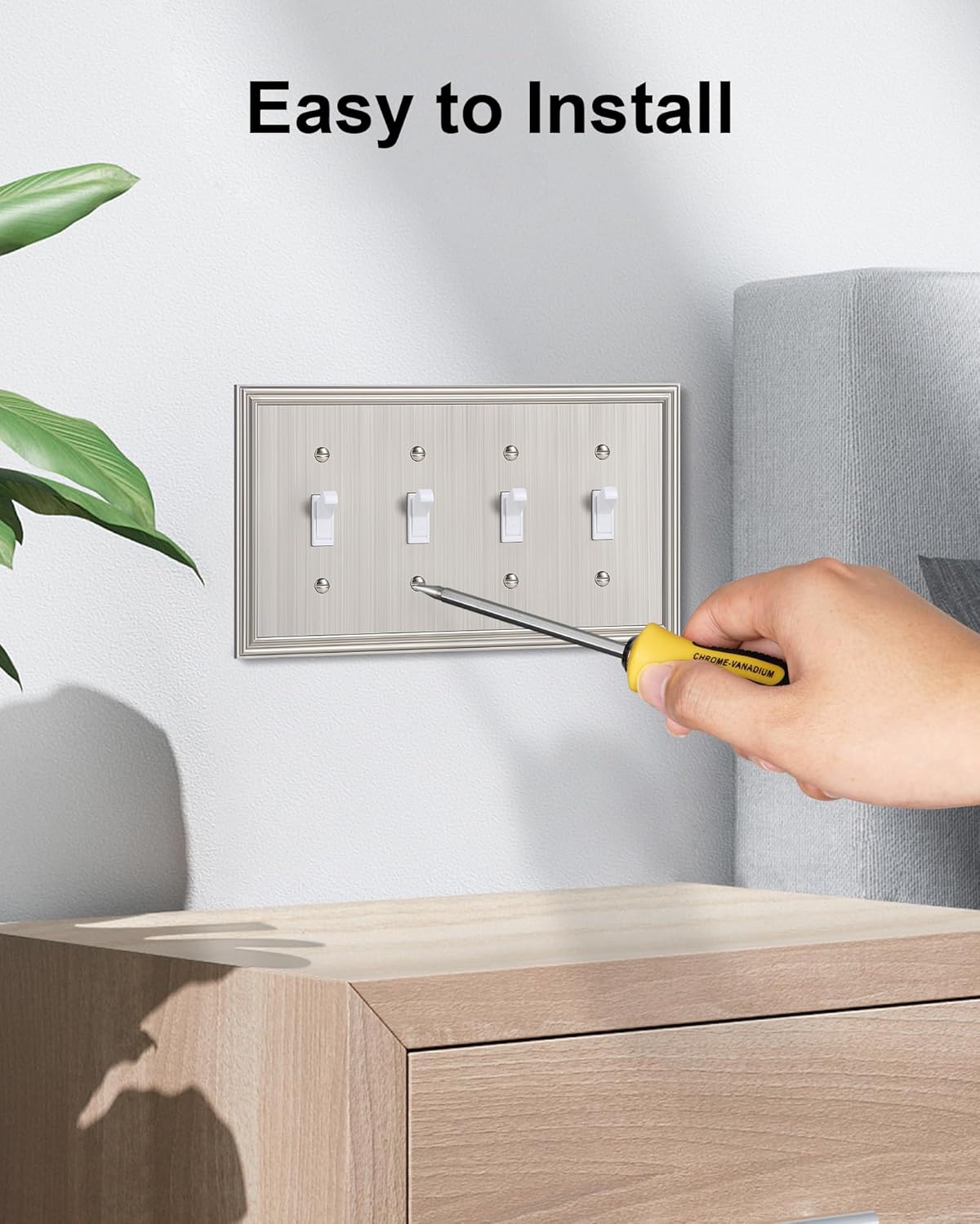 - Specification - Pack of 2 quad toggle metal wall plates, size at 8.58''W*4.92''H. Easy replacement of any wall plate with the same configuration, making it a convenient choice for remodeling or upgrading your home. Backed by a one-year warranty to ensure your peace of mind and complete satisfaction.
