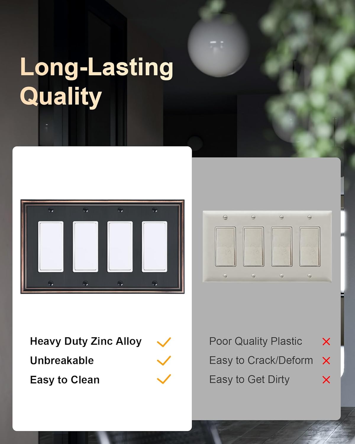 - Durable Solid Zinc Alloy - Constructed from thick and sturdy zinc alloy, the wall plate cover offers exceptional durability and sturdiness, easier to clean and maintain. It is resistant to high impact, tarnishing, and corrosion, unbreakable. Ensuring it remains a stunning addition to your home for years to come.