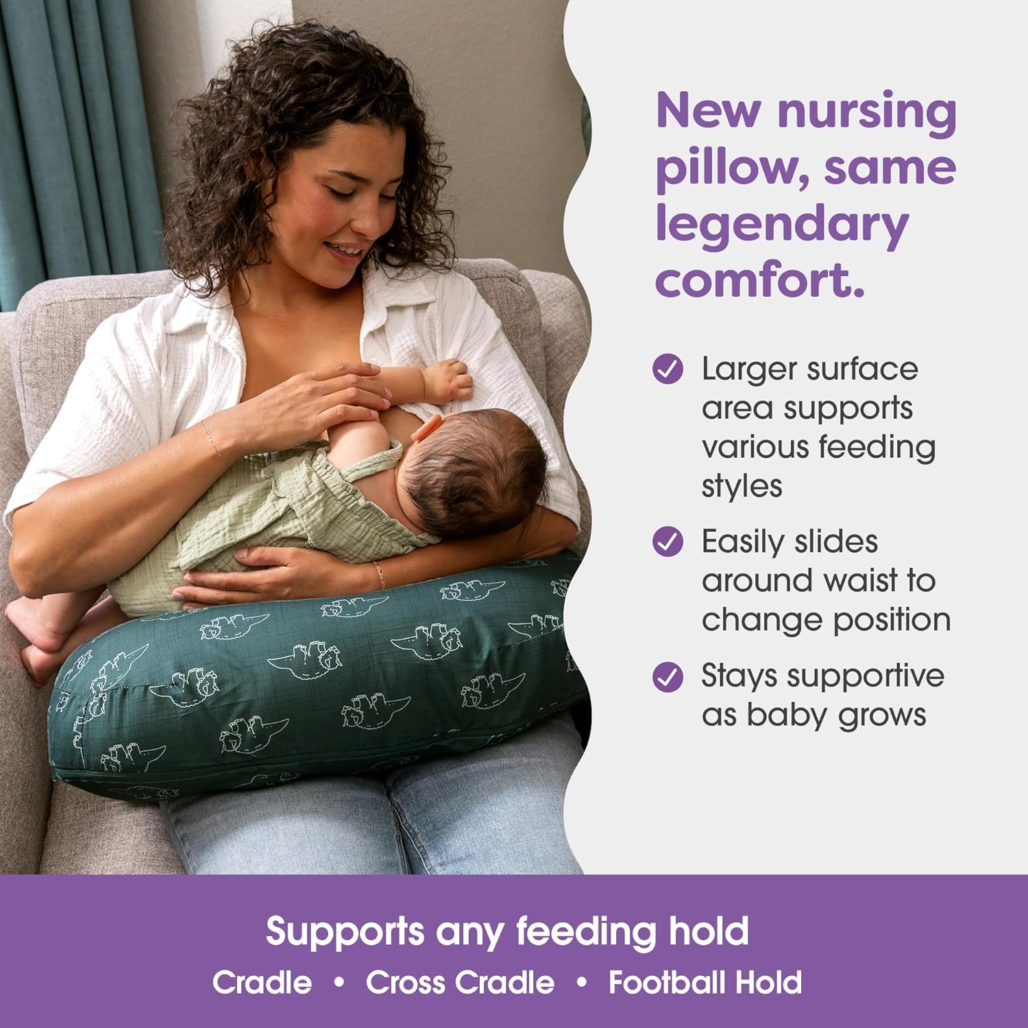 Boppy Nursing Pillow - Ergonomic Bottle & Breastfeeding Pillow with High, Firm, Large Area, Water-Repellent Cushion with Washable Cover; Baby Safety Alliance Verified - Forest Green Dinos