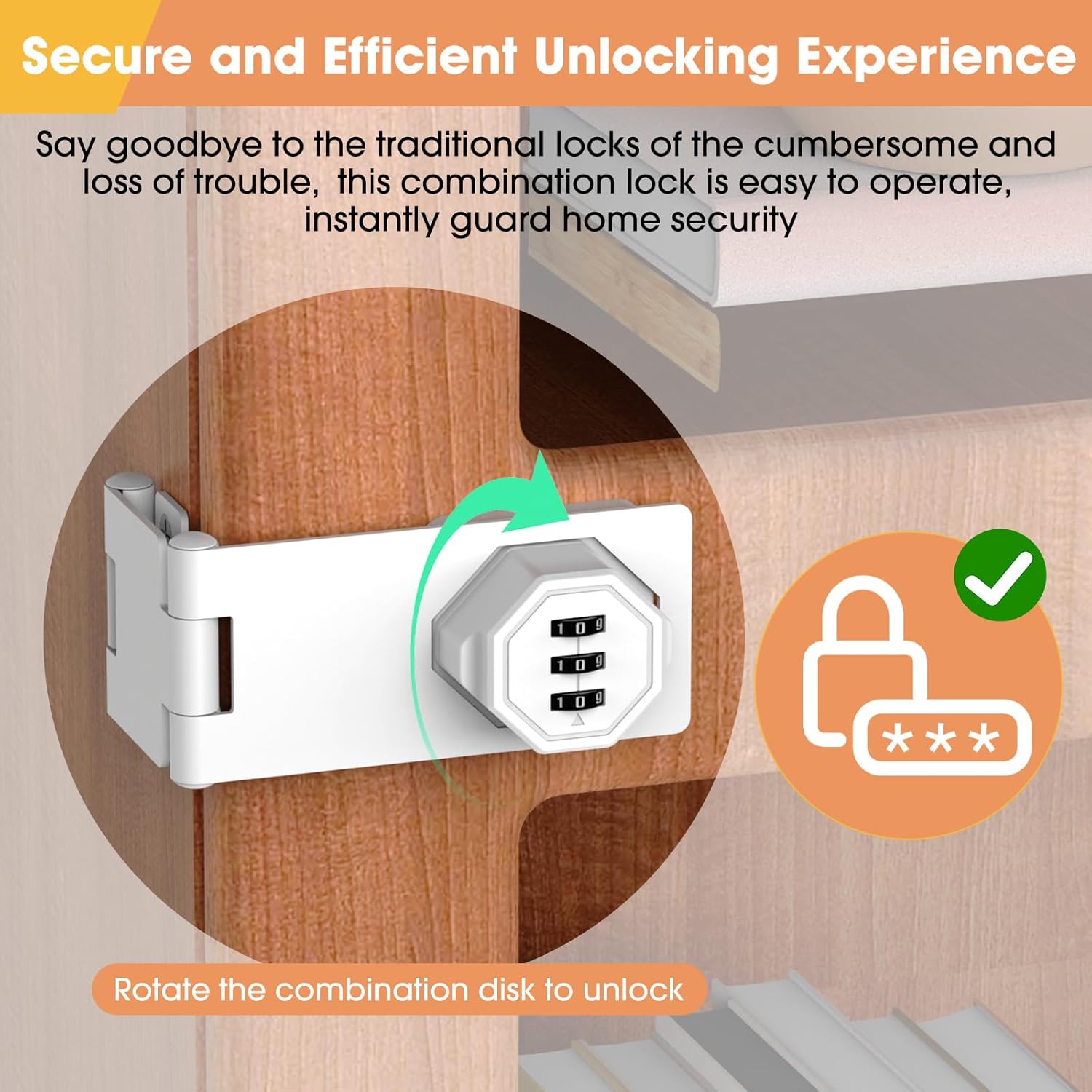 - Keyless Design: 90-degree folding door lock adopts digital combination technology, say goodbye to the inconvenience of traditional keys or padlocks, just turn the combination disk to the position of the preset password, you can quickly open the cabinet door or drawer