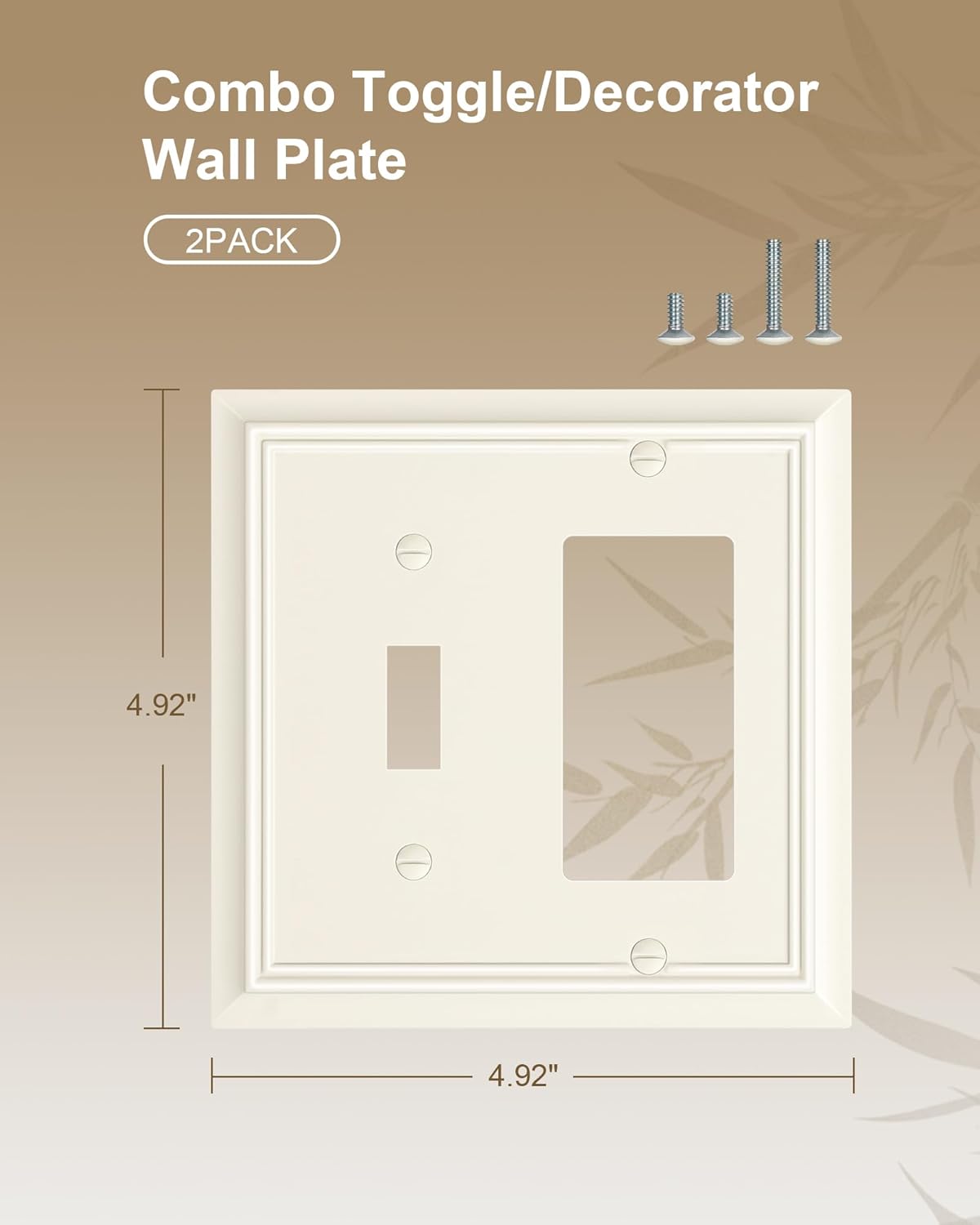- Specification - Pack of 2 Combo Toggle/Decorator bamboo wall plates, size at 4.92"W x 4.92"H. Easy replacement of any wall plate with the same configuration. Backed by a one-year warranty to ensure your peace of mind and complete satisfaction.
