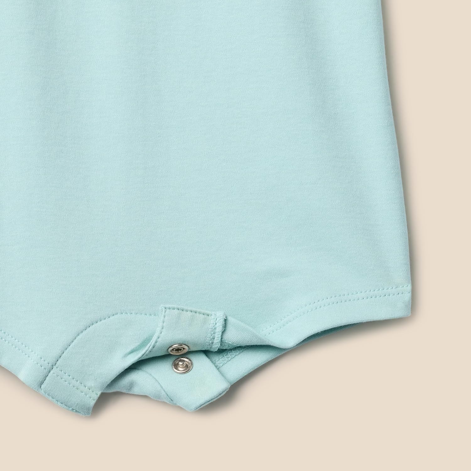 - DETAILS: Features a polo collar with a snap front placket and gusseted snap closure at leg opening